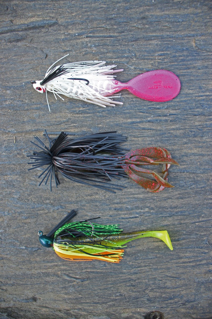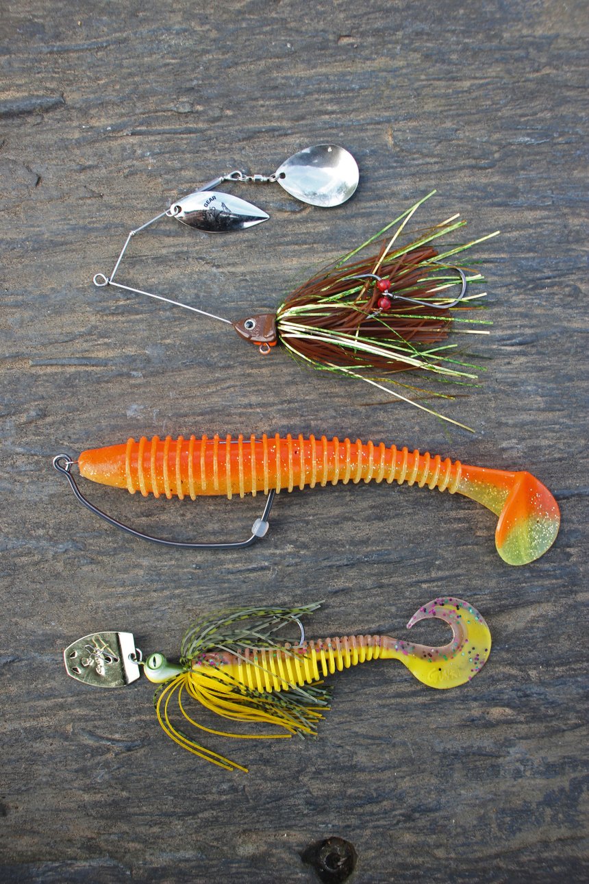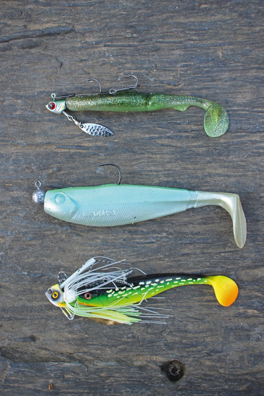 Il n’est pas nécessaire d’utiliser de gros leurres quand on les dépose au plus près des poissons, bien au contraire. Les montages lourds et imposants sont déconseillés pour des raisons évidentes de discrétion. On privilégie plutôt des leurres de 10 à 15 cm munis d’une plombée permettant une descente planante et d’un armement adapté pour pénétrer au plus creux des obstacles naturellement et sans accroc. Cependant, on doit pouvoir ferrer, combattre et parfois extraire en force les poissons des embâcles. Il est donc important d’utiliser un ensemble puissant. Ce peut être un ensemble spinning mais le casting permet tout de même de réaliser des lancers plus précis, plus discrets et assure un contact permanent avec la bannière. Choisissez une canne de 2,10m, avec une plage de puissance plus importante que nécessaire (20 à 24 g) pour bénéficier d’une réserve importante et d’un bras de levier lors des combats. Une action rapide est idéale avec une pointe suffisamment souple pour propulser aisément un montage qui n’excédera que très rarement 30 g. Équipez cet ensemble d’une tresse en quatre brins de fort diamètre (26 à 30/100), toujours plus résistante à l’abrasion qu’une huit brins et donc bien mieux adaptée pour pêcher ces zones encombrées. Terminez le montage par un bas de ligne court en fluorocarbone (90 à 100/100) avant d’y relier une agrafe par un nœud champignon.
