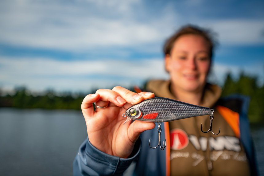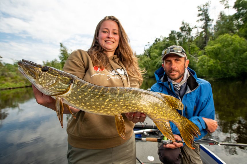 À la pêche, une touche, même si elle est loupée, est souvent un pas pour avancer dans la compréhension de l’état d’esprit des poissons. C’est un premier indice, une source d’information, mais ensuite il faut être capable de savoir le déchiffrer. Alors, évidemment, ça cogite dans la tête de notre ami. Il essaye d’analyser ce qui vient de se passer et il nous propose un plan de bataille : « Il faut un leurre qui attire l’attention du poisson, voire un leurre qui l’énerve, capable d’évoluer à grande vitesse en envoyant beaucoup de signaux. On va essayer un jerk, car le leurre doit être capable lors des arrêts de papillonner doucement en restant dans le champ de vision des poissons. » Julien donne à Céline un modèle aux flancs argent qui rassemble toutes ces qualités. Le but du jeu : lancer proche des structures, animer rapidement, voire sèchement, puis opérer de très longues pauses, bannière semi-tendue en espérant déclencher une touche franche. Le résultat ne se fait pas attendre ! Les brochets réagissent sur cette nouvelle présentation. Ce ne sont pas encore des attaques parfaites, car les poissons rechignent à prendre le leurre dans la gueule, mais la pêche est devenue plus excitante. Après plusieurs touches avortées, Céline ferre un poisson très correct en bord de gueule, mais suffisamment piqué pour enfin être monté au bateau. Les deux amis sont aux anges, sourire aux lèvres. À la pêche, tout peut changer rapidement !