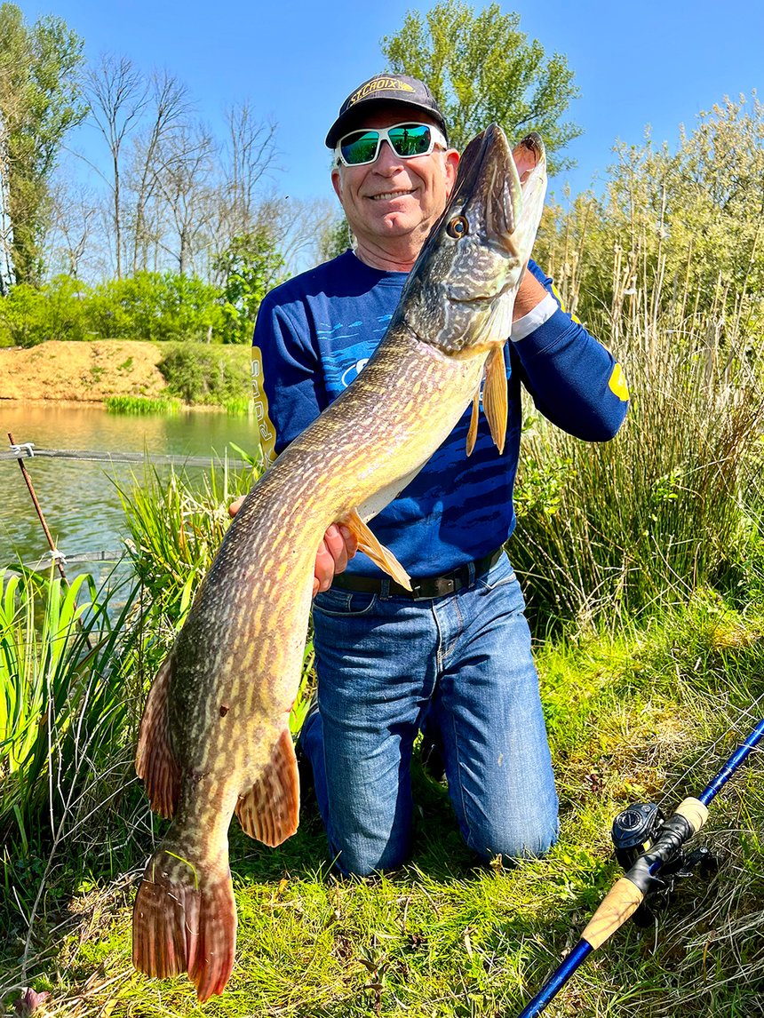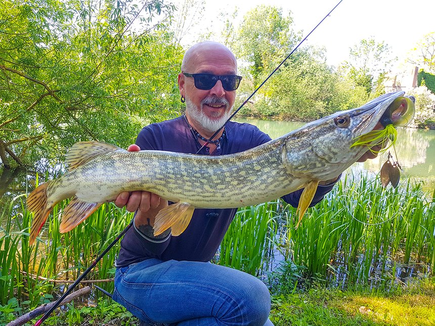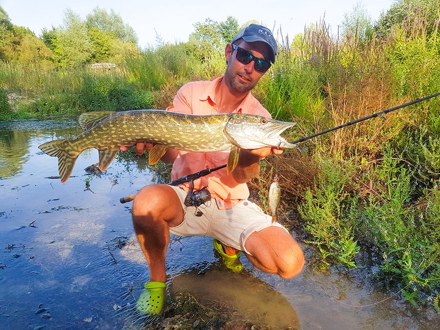 Au poisson vivant : la pêche au vif est une pêche ancestrale, que quasiment tous les pêcheurs connaissent et ont pratiqué au moins une fois dans leur vie. Elle a donc, à mon sens, toute légitimité à être présente dans ce papier comme technique pour pêcher le brochet du bord. D’autant que les mentalités et les techniques ont évolué, il n’est plus nécessaire de laisser partir des heures le bouchon avant de ferrer. Un léger décalage entre le moment de la touche et le ferrage permet bien souvent de piquer le brochet au bord de la gueule et ainsi de pouvoir le relâcher dans de bonnes conditions pour celui qui veut le relâcher. L’action de pêche est simple et se résume dans cet ordre : une canne de quatre à cinq mètres, un moulinet, du Nylon en 35 centièmes, un bouchon de 15 à 20 g, une olive de 10 à 15 g, un émerillon, un bas de ligne acier terminé par un hameçon simple (pas moins de ratés, et plus de chances de survie pour le brochet) et un petit poisson vivant de 10 à 15 cm. Il reste à choisir le poste (un calme en rivière, un arbre mort en étang, une irrégularité sur une berge de canal, la confluence entre deux rivières…) et mettre en action de pêche les cannes. Rien n’empêche, pour s’occuper en attendant la touche au vif, de lancer un leurre autour de ses cannes.