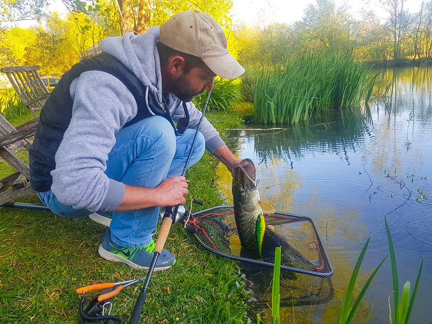 Au stickbait/popper : en été, il sera possible de pêcher au stickbait ou au popper. Quelle belle image que la prise d’un poisson en surface. Si les conditions sont calmes (peu de vent et soleil) on privilégiera la pêche au stickbait. À l’inverse, si les conditions sont dantesques, avec du vent, alors le popper aura toutes ses chances. Dans tous les cas, ces deux leurres permettent de prospecter du terrain, de pêcher peu profond et de passer là ou d’autres pêcheurs n’oseront pas lancer. Les herbiers, les nénuphars, les branches mortes, les rochers sous l’eau… sont autant de postes qui doivent attirer votre attention pour pêcher au leurre de surface.
