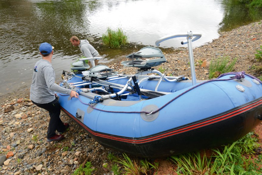 Le guide assis au milieu est aux commandes, en contrôlant la vitesse et la direction de son embarcation, une armature alu montée sur deux gros boudins. Deux sièges pivotants équipent l’avant et l’arrière du drift boat avec des barres de protection pour ne pas tomber à l’eau au moindre choc. C’est donc une pêche en mouvement qui nous attend, une pêche de postes, en mode « powerfishing ». Geoffray peut à tout moment freiner, contrôler la vitesse de dérive, autant que faire se peut, à l’aide des longues rames attachées par une sangle. En revanche, il ne peut pas immobiliser son drift boat une fois lancé, sinon dans les zones de retourne ou les calmes. Une ancre montée sur une poulie peut être directement actionnée par ses soins, mais lorsque le courant pousse trop fort, ce n’est qu’un moyen de ralentir sa vitesse. Notre guide vérifie chaque détail avant de lancer le « Go ». Tout le matériel est abrité dans des sacs étanches HPA fixés sur l’armature, les cannes attachées. Nicolas, un ami de Geoffray Begard et habitué de ce type de descente, nous a rejoint pour cette aventure. D’allure sportive, il monte à l’avant, prêt à en découdre. C’est parti !