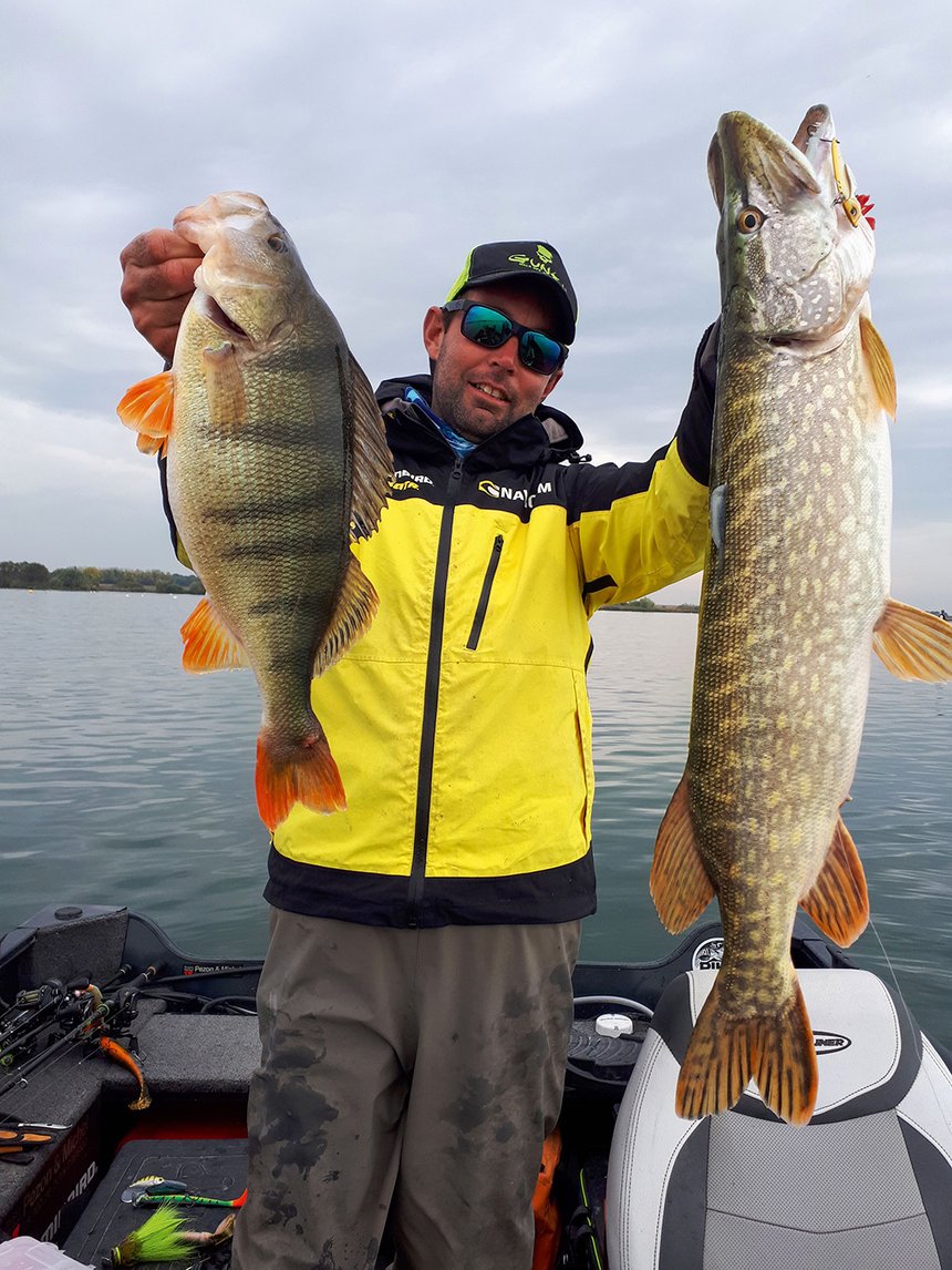 Pour cela « radio pêche », c’est-à-dire la prise d’informations auprès des copains, des magasins de pêche…, est une bonne alliée. Souvent en lac, tout est une histoire de profondeur. Je me souviens d’une partie de pêche sur le lac de Pannecière où tout se passait dans 9 m d’eau. 8,50 m pas de touche, 9,50 m non plus, mais dans 9 m, en verticale, c’était le feu. Shad de 8 cm, tête plombée de 14 g et en avant. Nous faisions des doublés, triplés de perches entre 30 et 39 cm. C’était magique, d’autant que dans ce lac aux eaux acides et froides du Morvan, les poissons grossissent moins vite que dans les lacs de l’Aube où je pêche régulièrement. Nous avions donc réalisé une très belle journée pour le secteur pêché. Sur les lacs de l’Aube, où je guide et je pêche plus régulièrement, il est possible de vivre des journées semblables mais avec une moyenne de taille encore plus élevée. C’est ainsi que j’ai connu à bord de mon bateau des journées à plus de 50 poissons avec aucune perche en dessous de 35 cm, mais plutôt des poissons entre 40 et 48 cm. Lors de ces journées incroyables, on peut voir les perches chasser les alevins sur l’échosondeur. Il fallait alors pêcher au jig, un peu à la manière de la pêche du bar en mer, pour les attraper.