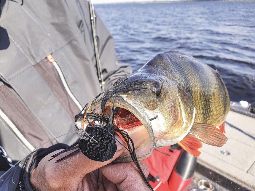 T. M. : C’est un leurre qui s’utilise toute l’année, à condition de varier les poids et les vitesses de récupération. Durant la période estivale on pêche vite et un peu plus haut dans la couche d’eau. En automne et en hiver, on ralentit la vitesse et on prospecte plus profondément. C’est propre au comportement du poisson et aux secteurs où il se tient. En ce qui concerne les espèces ciblées, comme pour beaucoup de leurres, le bladed jig a été mis au point pour la traque du black-bass, poisson que je pêche beaucoup. J’ai donc débuté avec cette espèce mais en adaptant un peu la taille et le poids, on peut capturer des perches, des sandres et des silures notamment. Il faut ajuster les trailers, les poids et les vitesses de récupération. C’est également très efficace sur le brochet !