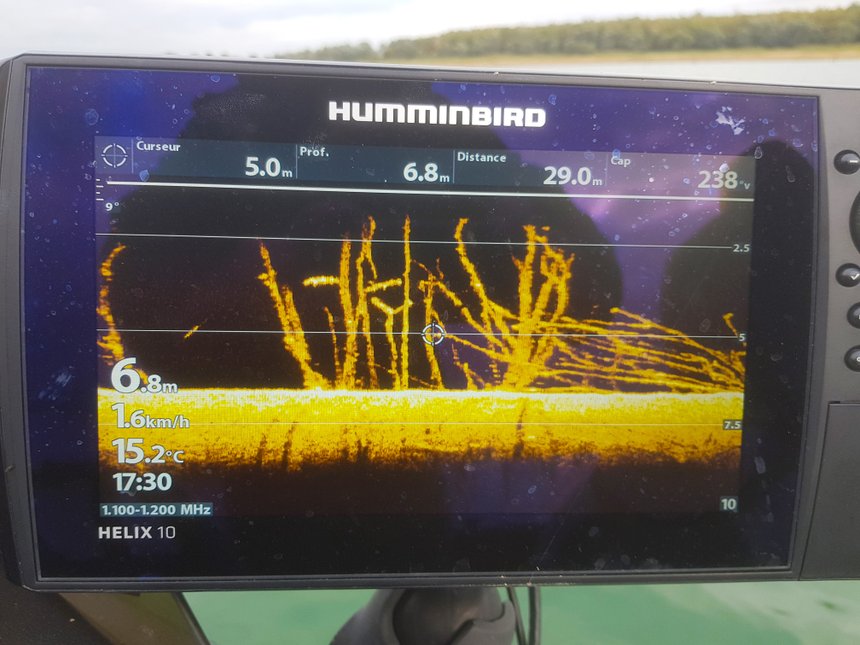 L’action de pêche n’est pas difficile et s’apparente à la pêche en verticale. On ne lance pas, mais on dépose le fireball avec le vif sous le bateau et l’on pêche à l’aplomb de ce dernier. Il faut ensuite avancer à la bonne vitesse. Pas trop vite sous peine d’être trop derrière le bateau, lentement étant pour moi l’idéal. Ainsi, j’essaie de rester dans le cône du sondeur pour voir les échos de brochet et les pêcher proprement avec mon fireball, en leur présentant sous le nez. S’il faut, je m’arrête même pour être plus insistant ; essayez, vous allez être surpris… Cette technique est redoutable sur les poissons apathiques. Les touches peuvent être violentes, à se faire arracher la canne des mains, tout comme subtiles : une sensation de lourdeur qu’il faudra sanctionner par un ferrage ample et appuyé. En pêchant à l’aide de l’écho, on peut aussi déterminer plus facilement à quelle profondeur sont les brochets actifs. En effet, il m’est arrivé d’attaquer des brochets postés près du fond sans obtenir la moindre touche, alors que les échos de brochets qui étaient actifs étaient ceux situés entre deux eaux. Cette recherche des brochets au fireball est sympathique et ludique, car on a la possibilité de voir les poissons à l’écho, d’apprendre à interpréter leurs mouvements en combinant 2D et down imaging, pour ensuite voir les touches en direct sur l’écran 2D. Sensations garanties. Je pratique cette technique lors de mes guidages, et beaucoup de mes pêcheurs en sont devenus accros !