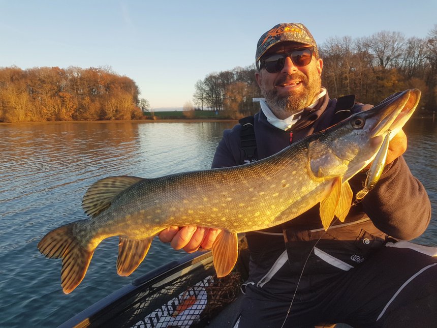 C’est la première des techniques que j’emploie lorsque l’eau se refroidit. En effet, arrivé à la mi-novembre, l’eau est souvent autour de 12 degrés. C’est le moment où les poissons vont se tenir au-dessus des herbiers qui commencent à mourir ou venir proche des bordures en lac de barrage de plaine. À ce moment, les poissons sont actifs et se pêchent entre 1 et 4 m de profondeur, pour une température d’eau variant entre 7 et 12 degrés. L’action de pêche consiste alors à pêcher au jerk minnow juste au-dessus des herbiers, proche de la bordure. La pêche est énergique et les pauses courtes. Il faut lancer au ras des obstacles, faire trois twitchs (animation consistant à secouer énergiquement et de manière serrée le scion de la canne pour donner une nage erratique au leurre) et une pause. On recommence l’opération jusqu’à ramener le leurre à ses pieds. Attention avant de le sortir de l’eau ; c’est souvent à ce moment qu’un poisson suiveur décidera d’attaquer votre jerk minnow. Lorsque la température de l’eau baisse et que la végétation aquatique disparaît presque totalement, il faudra alors augmenter les temps de pause. Entre 8 et 10 degrés, il faut ralentir l’animation mais faire des twitchs plus violents suivis de longues pauses. Cela permet de déclencher l’agressivité des brochets en poste, et la pause leur laisse le temps de cibler l’attaque. D’ailleurs la touche survient souvent à la pause (toc franc dans la canne) ou au moment où l’on redémarre l’animation (sensation de lourdeur). Dans tous les cas, le ferrage devra être ample et énergique afin de bien accrocher le leurre dans la gueule du brochet. Afin d’être efficace dans la pêche, munissez-vous de plusieurs jerk minnows suspending (qui restent entre deux eaux à la pause : B’Freeze Lucky Craft, Magsquad 128 Illex), sinking (qui coulent lentement : Squad Minnow 95 HW Illex) et de jerk minnow à grande bavette (DD Arnaud Illex, Realis 100 Deep runner Duo, Staysee Lucky Craft).