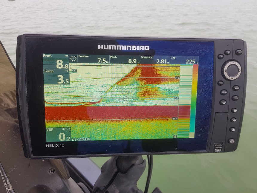 Interprétation des échos : cette technique se pratique à l’aide d’une embarcation et d’un échosondeur. Il faudra déterminer les zones de tenue des poissons (souvent les endroits profonds) et voir s’ils sont collés sur le fond, près des poissons fourrages ou entre deux eaux.