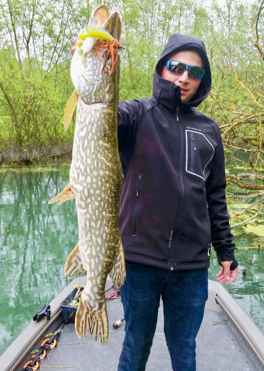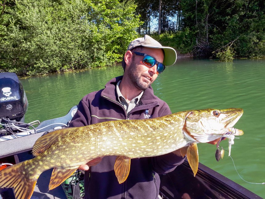 J’aime son côté 4×4 qui passe partout sans s’accrocher, que ce soit en rivière ou en plan d’eau. De plus, le brochet est un poisson sensible à la palette, il ne reste donc vraiment pas indifférent à ce leurre. Mais revenons à cet aspect 4×4. Le spinnerbait, du fait de sa conception, joue le rôle de déflecteur lorsqu’il rencontre les obstacles. La condition est de ne pas laisser de mou lorsque l’on tape la branche par exemple, sinon il se met sur le côté et s’accroche. Il faut donc ramener en linéaire, taper l’obstacle sans ralentir, puis continuer sa récupération de manière linéaire ou le laisser planer juste après sa rencontre avec l’obstacle. Cette dernière méthode permet souvent de déclencher l’attaque d’un poisson suiveur, juste avant que le leurre ne sorte de la zone encombrée et ne lui échappe. Le spinnerbait est aussi à l’aise dans les herbiers. On pourra pêcher en linéaire au-dessus de ces derniers, ou au milieu des trouées d’herbiers, en le laissant descendre à l’intérieur des trous. Cette technique s’appelle pêcher en « free falling » et donne de très bons résultats dans les milieux fort encombrés. Le spinnerbait est aussi un très bon leurre de pleine eau. Il permet de pêcher vite et de couvrir beaucoup de terrain. Cette technique dite de « power fishing » permet de cibler les poissons actifs. On peut jouer sur la forme des palettes en fonction de ce que l’on recherche : palette feuille de saule pour les pêches rapides en milieu dégagé et palette colorado (ronde) pour les pêches plus lentes lorsque l’on veut que son leurre avance lentement au milieu de zones encombrées : herbiers denses, bois morts en pleine eau… Il émet ainsi de plus fortes vibrations qui vont chercher les carnassiers en profondeur dans leur cache et les incite à sortir. De plus, la récupération plus lente dans cette zone encombrée laisse au brochet le temps de cibler son attaque plus facilement. On associe le spinner aux journées venteuses. Effectivement, c’est une vérité mais attention, il marche toute l’année, même sans vent. Pour ma part, j’aime l’utiliser dès la fin du printemps, tout l’été et au début de l’automne. En lac et en étang, il excelle pour les pêches d’herbiers et de bois morts, alors qu’en rivière, on en tire le maximum de bénéfice pour pêcher les zones de courant et les « culs » d’herbiers. Il n’a pas son pareil pour déloger un brochet posté en fin de courant, derrière son herbier pendant la saison estivale.