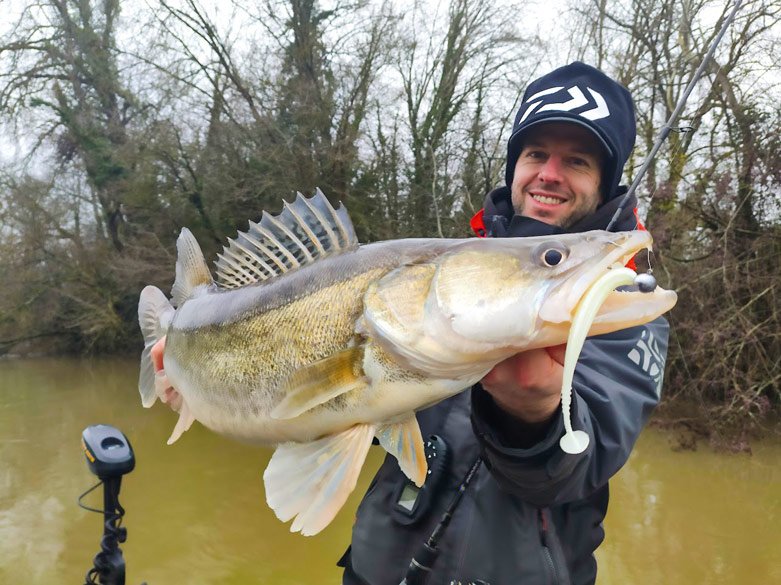 Dans le froid, les techniques de traque les plus lentes sont les plus efficaces. Ainsi, la verticale, le manié (très lent) et le drop-shot ou drop-bait réserve toujours de belles surprises. Du fait du caractère capricieux des sandres, il est impossible de prédire la technique de traque ou le leurre qui remportera le plus de succès. Il faut donc s’armer de patience et tenter des choses. Avec l’expérience, un bon pêcheur de sandre sait ce qui fera la différence et sera efficace pour séduire les carnassiers. Aussi, le premier indicateur que vous devez prendre en compte est la couleur de l’eau. En effet, cette information va définir la couleur des leurres souples (LS) que vous allez devoir utiliser. Au fil des décennies, un nuancier de couleurs a été défini. En effet, avec une eau en crue boueuse (marron chocolat), ce sont des leurres noirs ou rouges qui peuvent déclencher les touches. Mais les premiers jours de la crue sont rarement productifs, car, souvent, l’eau perd en température, c’est d’ordinaire ce qui bloque l’activité des carnassiers. En continuant sur l’échelle des couleurs, un fleuve ou une rivière moins chargée mais toujours marron (visibilité moins de 5 cm), misez sur l’orange ! Peu utilisée par les passionnés, cette nuance permet souvent de renouer avec le succès. Au-delà de 10 cm de visibilité, dans de l’eau moins opaque, le vert chartreux et le jaune fluo sortent du lot. Lorsque la couleur du milieu arrive sur des visibilités supérieures à 50 cm, mais toujours sur des eaux légèrement cassées, le blanc et le rose doivent être tentés. Et même si cela peut paraître absurde à nos yeux d’humain, les sandres font la différence entre un blanc uni et un blanc nacré.