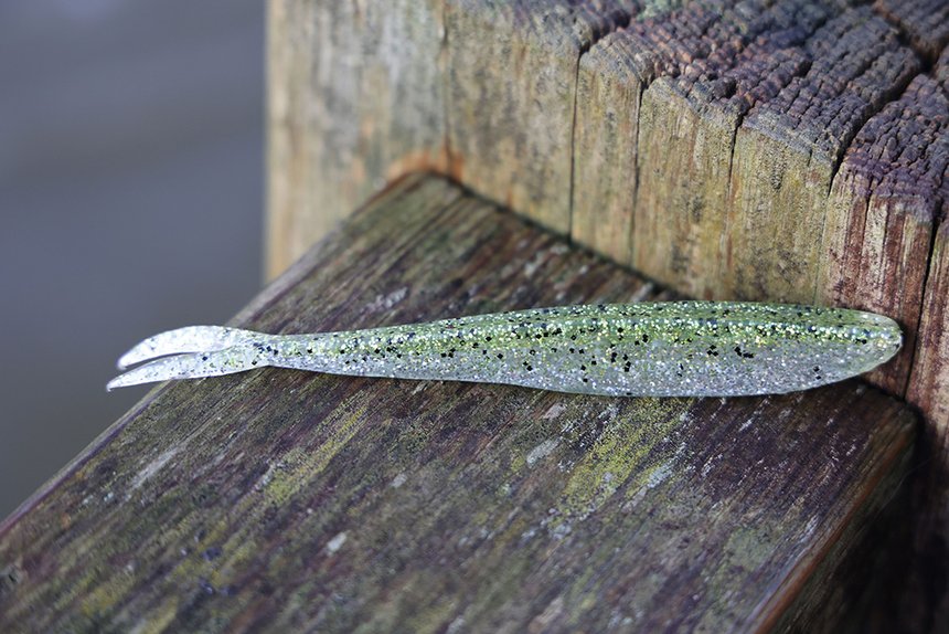 • Le finess à queue en V : il a le corps légèrement aplati sur les flancs et se termine par une queue en V. Entrent dans cette catégorie le Fin-S fish de Lunker City, le Gunky vriggle, le Sling Shad Megabass… C’est le finess parfait pour pêcher en linéaire lorsque l’eau descend sous les 6°C. Sa gomme assez dure et ses faibles vibrations le rendent redoutables sur les poissons léthargiques ou trop pêchés.