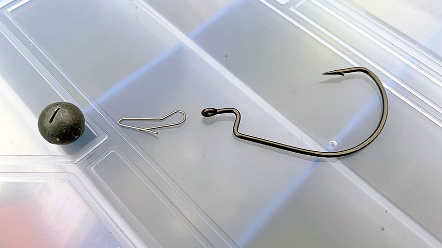 Le système Cheburashka se compose d’une plombée sphérique en plomb ou tungstène, munie d’une fente interne et d’une agrafe préformée que l’on associe dans la plupart des cas à un hameçon texan destiné à recevoir un leurre souple. Pour réaliser le montage, il suffit de passer l’agrafe dans l’œillet de l’hameçon, de glisser le lest sur l’agrafe et de raccorder la ligne à l’extrémité de celle-ci pour obtenir un ensemble prêt à pêcher. C’est aussi simple que cela ! Avec, en prime, l’avantage que chaque élément puisse être échangé ou remplacé en un tour de main.