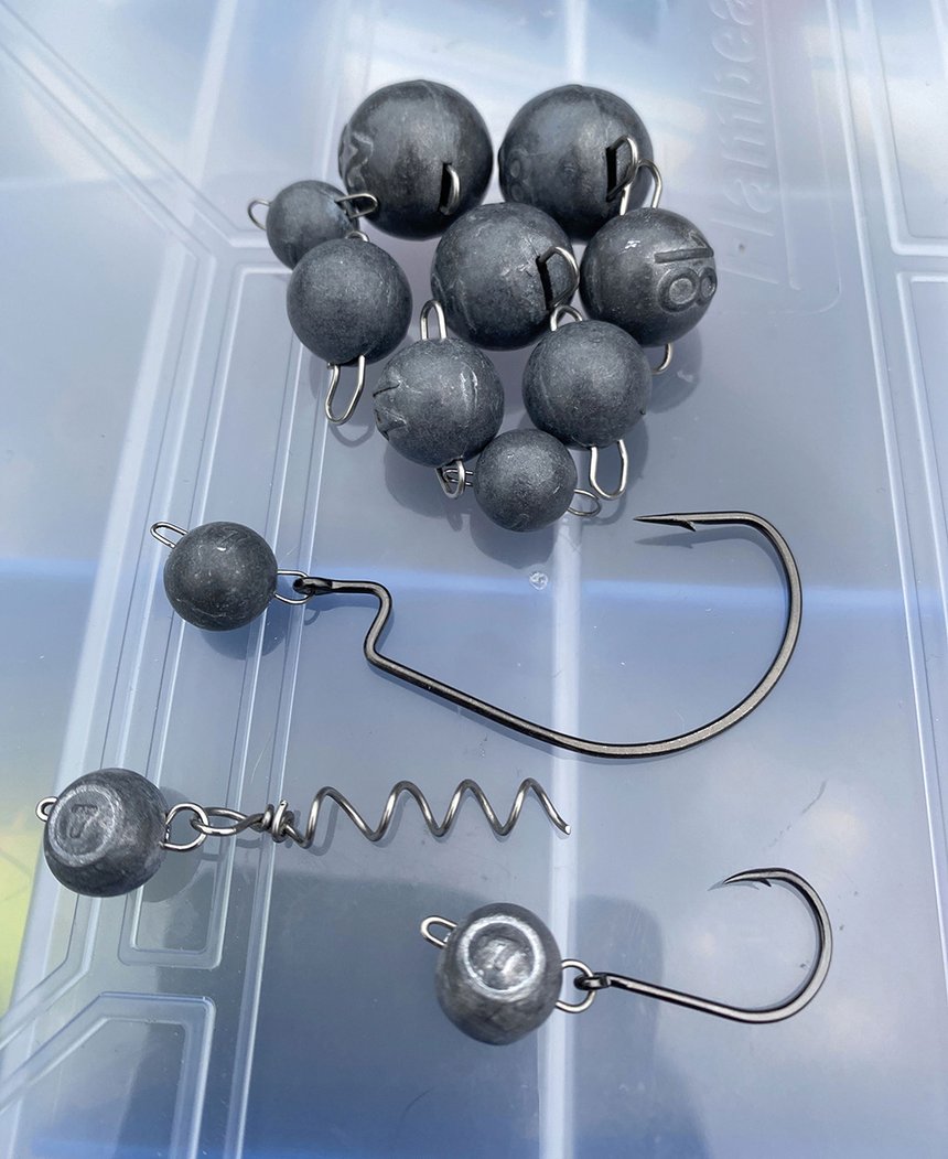 Indépendamment de la taille du leurre, l’utilisation de différents grammages allant de 3 à 21 g permet d’ajuster le montage aux conditions du moment et de l’endroit. À poids identique, un modèle réalisé en tungstène possède une densité et une dureté plus importante qui lui permettront de descendre plus rapidement dans la couche d’eau, mais aussi de mieux transmettre la perception des contacts avec le fond et les structures. Si, autrefois, les séances de mise en peinture des chevrotines de mes montures Drachko ne me rebutaient pas vraiment, car cela faisait partie de l’engouement pour la pêche du sandre, je dois avouer apprécier grandement de pouvoir disposer de modèles directement colorés avec l’avantage qu’ils tiennent beaucoup mieux dans le temps. On peut ainsi disposer de couleurs très flashy que l’on peut utiliser en harmonie avec celles du leurre afin de donner du volume ou, au contraire, pour créer un contraste afin de susciter l’intérêt des sandres. Les teintes dorées et argentées très brillantes restent des valeurs sûres dans la combinaison avec des leurres de teintes naturelles. Parmi les nombreux modèles disponibles sur le marché, on peut constater des différences très marquées entre les produits. Dans tous les cas, écartez les modèles avec une agrafe ridiculement fine ou qui passe complètement à travers le lest, un lest dont la fente n’est pas légèrement décentrée et ceux qui ne disposent pas d’une identification du poids.