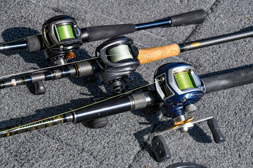 Pour la pêche des brochets en mai, je préfère utiliser mon bateau afin de réaliser une traque très active. Il est tentant de vouloir prendre une grande quantité de matériel à bord, mais je choisis de me limiter afin de moins m’éparpiller. Je sélectionne trois cannes casting, toutes d’une longueur de 2,40 m.