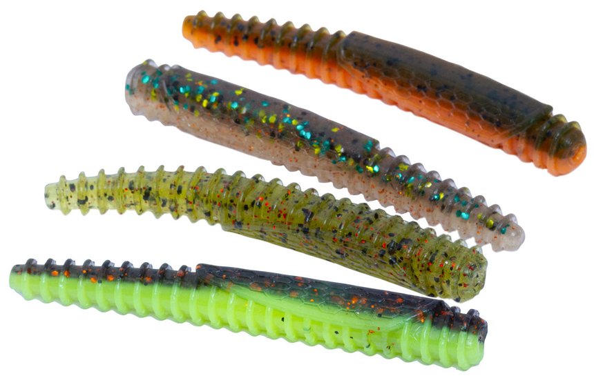 Dans la main, ces vers et frites peuvent laisser dubitatif. Ils sont en général fabriqués dans des plastiques, élastiques ou TPE plus ou moins fermes, ne vibrent et n’ondulent pas. N’essayez pas de les faire nager, vous serez déçus. Mais ils prennent du poisson ! Sur les black-bass c’est un fait avéré, nombre de compétitions américaines ont été gagnées avec ce type de leurre et ils sont dans toutes les boîtes des pêcheurs et compétiteurs. En Europe, et en France notamment, leur arrivée récente ne leur a pas encore permis de gagner leurs lettres de noblesse. À tort. Il y a deux grandes formes distinctes, les vers, souvent annelés et souples et les frites un peu plus trapues, « presque des potatoes », s’amusait Sylvain Legendre lorsque je l’ai interrogé sur sa technique de pêche à l’aide de ces leurres. Rapala vient de sortir un ver muni de fourreaux alaires qui lui donnent un look de grosse larve, les Ned BLT.