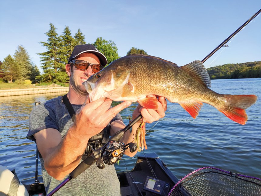 Avant de partir à la conquête des grosses perches, il est crucial de sélectionner le bon matériel. Une canne légère et sensible, associée à un moulinet de qualité, offre la réactivité nécessaire pour ressentir les moindres touches. Une canne en 5/14 g ou 7/21 g pour 2,20 m est idéale. Pour ma part, j’utilise une Prorex AGS, légère et très sensible. Je lui associe un moulinet Fuego LT 2020 en taille 2000 qui suffira amplement. Les leurres jouent également un rôle essentiel. Qu’ils soient souples imitant des proies naturelles, ou durs comme les petits crankbaits aux couleurs vives, tous vont jouer un rôle différent, certains vont déclencher l’agressivité de la perche et d’autres jouer sur l’appétit du poisson. Mais il faut bien garder à l’idée que si vous cherchez des perches avec des leurres de 2 pouces ou avec des micro-jigs, le risque est de faire beaucoup de petites perchettes. Ce qui, bien sûr, peut être sympa quand on veut s’amuser un peu. Mais si vous cherchez des grosses mémères, il va falloir changer radicalement de stratégie. Pour sélectionner les grosses perches, je pêche avec des tailles de leurres en 4 pouces minimum (10 cm). Mais c’est en général avec des leurres de 12 cm que je prends les plus beaux spécimens. Mes couleurs préférées sont le marron/orange, vert chartreux et le fire tiger. J’affectionne particulièrement les leurres avec une caudale très mobile comme le D’Fin qui vont vibrer à la moindre sollicitation. La plombée varie de 7 à 10 g suivant la profondeur et le courant.