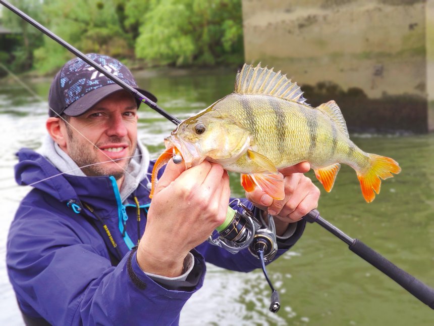 Le frai de la perche va s’étendre entre mars et mai suivant les régions, quand la température de l’eau se situe autour des 14°. Le moment clé pour espérer attraper une perche de plus de 40 cm va être juste après le frai, quand elles sont amenées à se rapprocher des berges. Cette période où bon nombre de poissons blancs se reproduisent est essentielle dans l’alimentation des carnassiers. Les herbiers, les bordures de nénuphars et les structures immergées sont des endroits propices à leur quête de nourriture. En adaptant votre technique à ces zones, vous allez maximiser vos chances de succès. En milieu urbain, les quais sont très bons, les péniches stationnées à l’année peuvent parfois abriter de belles colonies et les piliers de pont sont très appréciés des perches qui peuvent s’abriter du courant. Les spots qui retiennent tout particulièrement mon attention sont les palplanches. Ces murs d’acier fixent souvent de très grosses perches. Je peigne le long en commençant très près de ceux-ci. En général, dès les premiers lancers, il est facile de savoir si des perches sont sur le secteur. Je décale progressivement mes lancers si je n’ai pas eu de touches. J’ai remarqué que les palplanches sont meilleures quand il y a beaucoup d’eau au pied. Minimum 2 m.
