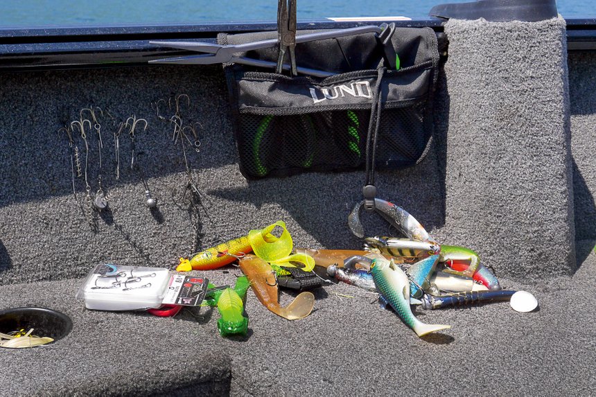 Pour passer de la recherche des brochets à celle des silures, Jimmy exploite les fenêtres et les journées durant lesquelles les brochets se montrent récalcitrant, et où, simultanément, les silures semblent bien mobiles et bien présents à l’échosondeur. « Sur les lacs, j’observe quand même souvent des comportements grégaires chez les silures, avec des regroupements denses sur des zones bien précises mais complètement pélagiques. » Dans ces cas-là, deux options s’offrent au guide. Si les stagiaires sont d’un bon niveau dans la pêche en lancer-ramener aux leurres et ne montrent pas de lassitude technique dans l’application de cette prospection, alors Jimmy n’hésite pas à chercher les silures aux leurres en linéaire. À ce sujet, nos observations se rejoignent en tous points : « Inutile de surdimensionner les leurres, bien que le silure soit un poisson plus long que le brochet, je dirais même qu’en moyenne, j’utilise des shads plutôt plus petits, 15-16 cm en général », indique Jimmy. Ces leurres font déjà partie de sa panoplie de traqueur de brochet.