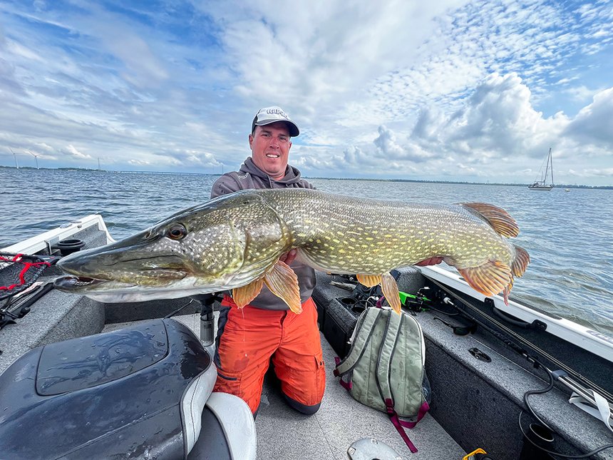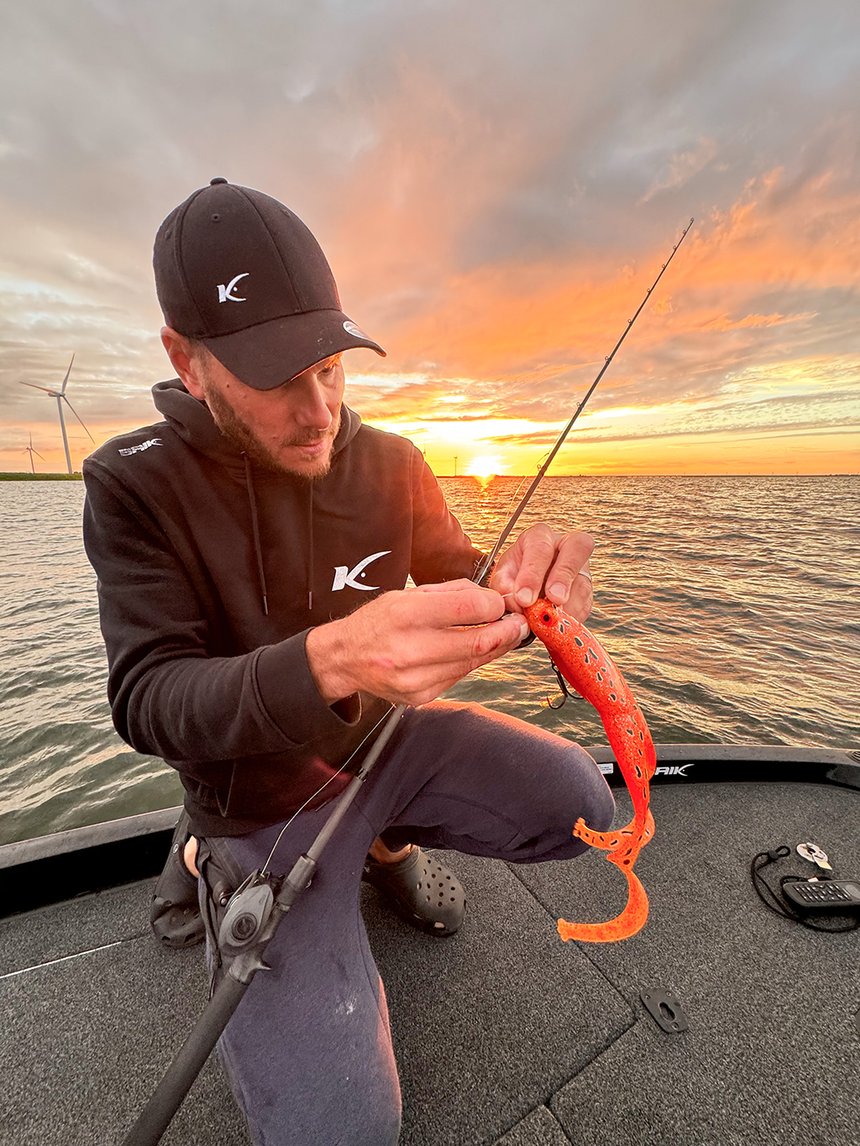 En général, j’aime bien rechercher les vrais gros brochets, c’est ma priorité quand je suis sur l’eau. Je ne m’attarde pas sur les petits poissons. J’ai la chance de pêcher dans les grands fleuves, lacs et deltas hollandais et la population de beaux brochets y est importante. Donc je ne pêche plus qu’aux gros big baits, entre 18 et 40 cm pour les leurres souples et entre 16 et 30 cm pour les durs, jerkbaits ou swimbaits. Cela permet de trier. J’ai moins de touches, mais je sollicite de plus gros sujets, c’est évident. Ça ne veut pas dire que les gros brochets n’attaquent pas de petits leurres ! En février et mars, il s’en prend chaque année en cherchant les plus belles perches. Le reste de la saison, ces gros leurres sont une valeur sûre pour sélectionner les plus beaux poissons. Je ne me prends pas trop la tête pour les couleurs. Je choisis des nuances imitatives lorsque la pêche est compliquée et plus agressive, orange, Fire Tiger quand les poissons sont actifs. Pour le bruit, c’est comme pour la couleur. Silencieux si les poissons sont méfiants et, au contraire, bruyants s’ils chassent vraiment. J’utilise deux combos, entre 2,20 et 2,40 m en casting. L’une a une puissance de 40 à 120 g et la seconde jusqu’à 250 g. Je ne prends plus d’action de pointe mais des semi-progressives plus confortables pour lancer de gros leurres. Elles absorbent mieux le ferrage, je n’ai presque plus aucune coupe et j’ai moins de décrochés. Le bas de ligne en fluorocarbone est en 0,90 à 1 mm et mes tresses au minimum en 0,28 mm, mais le plus souvent entre 0,30 et 0,40 mm. Il ne faut pas finasser avec ces gros brochets. Le combat doit être rapide pour les relâcher dans de bonnes conditions !