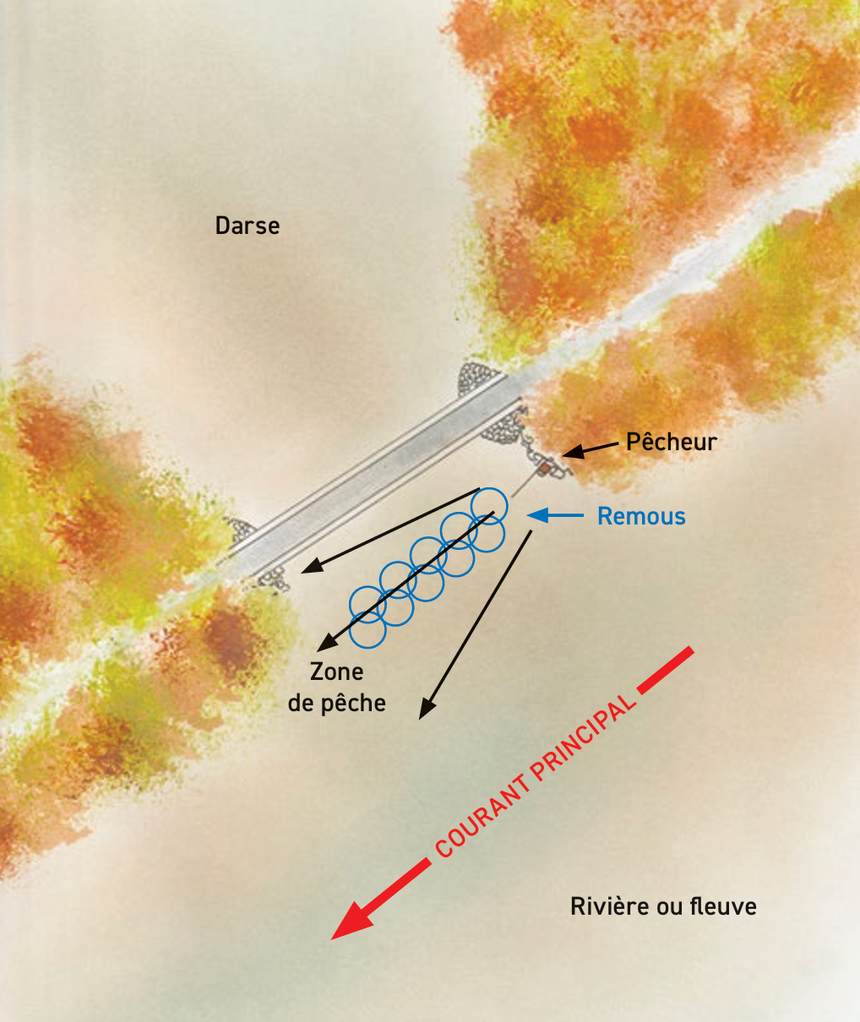 Les lancers sont effectués vers l’aval (voir croquis). Si vous pêchez vers l’amont le montage est ramené par le courant en direction du pêcheur, ce qui limite l’effet planant du montage et augmente énormément les risques d’accrochages au fond. Une fois le lancer effectué, fermez le pick-up et laissez le montage couler lentement au fond en surveillant le moment où la bannière se détend. Attention les touches peuvent arriver dès la première descente ! Pour l’animation, dans bien des cas, contentez-vous de deux ou trois tours de manivelle du moulinet ce qui fait décoller le montage de 20 à 30 centimètres au-dessus du fond. Attendez ensuite que le montage retourne lentement au fond. La touche survient souvent dans cette phase de descente. C’est une pêche en linéaire, assez lente et insistante où la légèreté du montage oblige à pratiquer des pauses pour reprendre contact avec le fond très régulièrement. La violence des touches est toujours incroyable ! Les sandres affamés donnent de violents coups de tête dès le début du combat. Un plaisir pour le passionné. La pêche du bord est une technique simple, nécessitant très peu de matériel et qui malgré cela est redoutable d’efficacité à certains moments de l’année.