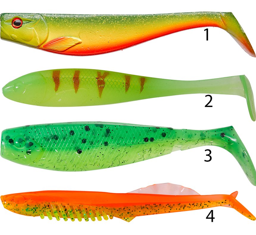 Pour cette technique j’utilise plusieurs leurres souples suivant les circonstances. Aux heures extrêmes de la journée, j’opte pour des modèles qui vibrent beaucoup. Je choisis des shads à larges caudales comme le Dexter Shad 150 (1) d’Illex en fluo jaune ou sombres voire noirs. Par faible luminosité, ces teintes sont efficaces sur le sandre. Le reste du temps, j’essaye plusieurs coloris et types de vibrations pour trouver la combinaison la plus efficace du jour. J’utilise essentiellement des shads de 10 à 15 cm comme le Magic Slim Shad d’Illex (2), le G-Bump (3) ou le V3IB (4) de Gunki qui a des vibrations plus fines. En plein jour les couleurs flashy ont ma préférence, mais je n’hésite pas à utiliser des couleurs naturelles même dans une eau très teintée.