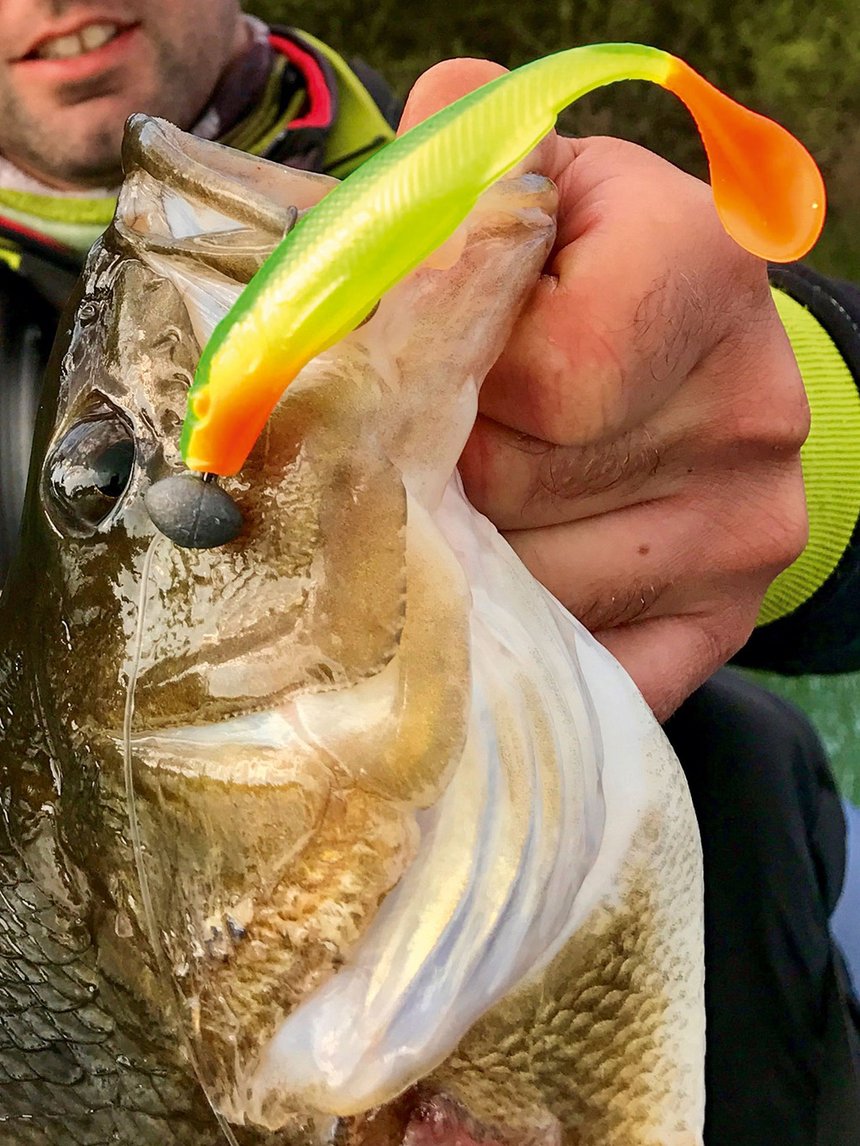 • Les leurres souples : je les emploie pour pêcher la cassure des zones shallow. C’est-à-dire lorsque les poissons ne sont pas en chasse et stationnent au pied de la cassure. Lors de ces situations, un shad imitatif de 6-10 cm animé sur le fond ne laissera pas insensible les perches. Lorsqu’on localise ces dernières au pied des structures immergées de type petit arbre noyé ou branchette, je vais utiliser un grub (queue virgule) pour capturer ces dernières. Le grub se met en action de pêche à la moindre sollicitation du pêcheur, il peut pêcher très lentement, et son aspect souvent filiforme le fait parfaitement passer dans et autour des structures, sans trop s’accrocher. Ramené doucement, c’est le leurre adapté pour rechercher les perches au printemps en étang sur ce type de structure immergé. Qui plus est lorsqu’elles sont peu actives. Les leurres souples (grub ou shad) sont aussi efficaces lorsque l’activité au leurre dur baisse. Les poissons peuvent commencer à se méfier de ce dernier, et les touches diminuent par la même occasion. C’est le bon moment pour pêcher plus discret, au leurre souple, et ainsi de continuer à enchaîner les perches !