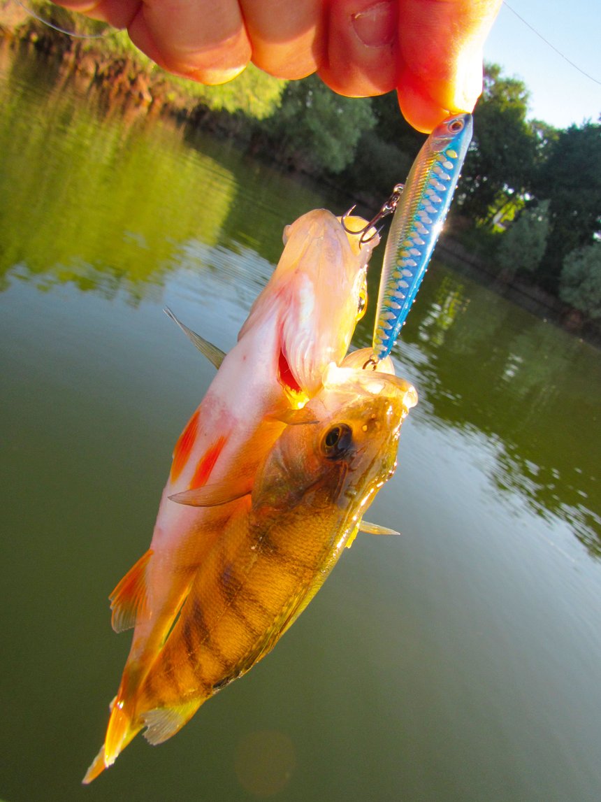 Tanguy Marlin, spécialiste incontesté de cette technique, nous livre ses astuces pour les belles perches des lacs du Sud-Ouest : « J’utilise deux cannes différentes pour les leurres de surface. Pour le stickbait, rarement en taille inférieure à 10 cm pour pêcher vite les beaux poissons actifs, c’est un ensemble casting en 10/30 g de 2 à 2,15 m de long. Pour les poppers de 5 à 8 cm destinés à des pêches plus lentes, sur des poissons plus apathiques, je pêche en spinning avec une canne de même taille, mais en puissance 3/15 g. Ma recherche se fait près des herbiers au printemps et en été, et en périphérie des rassemblements de blancs en automne. Mes leurres préférés sont le Mousty qui claque fort et le Naja au son cristallin. Comme popper, j’utilise le Pop’n Dog en 55 et 70 mm de Sakura. »