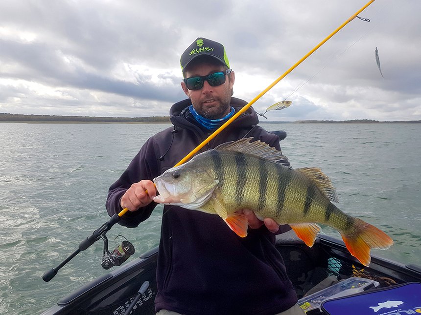J’utilise beaucoup les lames métalliques lorsque les perches chassent à la fois proche du fond et entre deux eaux dans la boule de poisson fourrage. C’est un moment où elles sont super actives, et il faut en profiter. On peut les faire sur le fond en ramenant sa lame entrecoupée de pauses, puis, si rien ne se passe, en milieu de récupération, on ramène sa lame depuis le fond vers la surface en traversant le banc de poisson fourrage en diagonale. Il y a fort à parier que vous allez finir votre récupération avec un poisson au bout de votre lame !