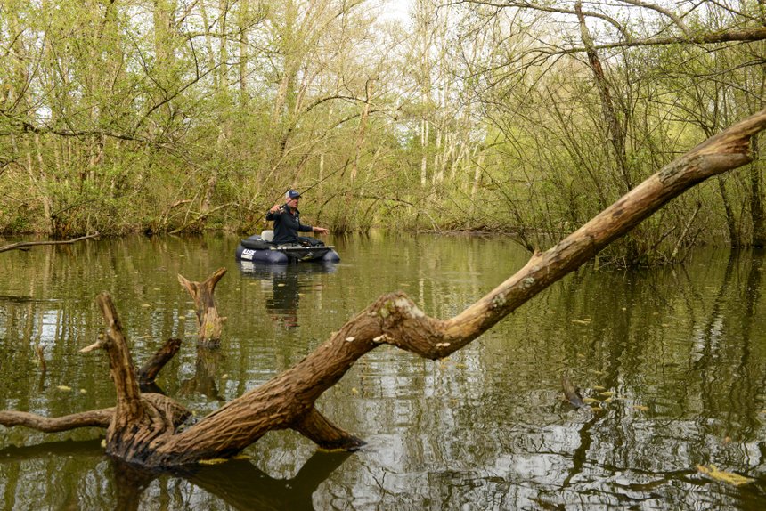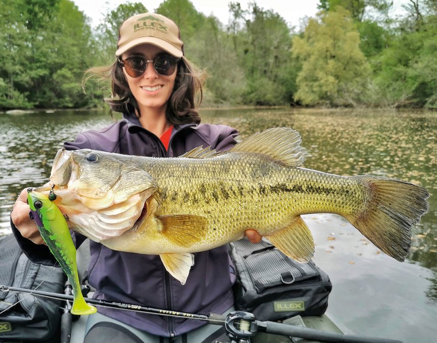 Si Maeva continue sur la bordure avec succès, Christophe tente la pleine eau afin de l’emporter au poids. Il sait que de gros bass affectionnent la rupture de pente où des bois noyés sont enchevêtrés. Swims durs ou souples, leur taille, entre 16 et 18 cm, ne laisse aucun doute sur les intentions de notre mousquetaire ! Mais au bout d’une heure de prospection assidue, Christophe se rapproche de la bordure où Maeva creuse tranquillement l’écart en points ! Jig noir trailer écrevisse : c’est décidément le pattern du jour ! Le temps se couvre. Après une remontée contre le vent qui a forci, Christophe s’enfonce dans la « mangrove ». En tête du lac, peu profond, de nombreux canaux se ramifient entre des îlots de végétation. Le float-tube fait merveille pour soigner sa discrétion. Changement de combo, plus puissant, un 35/100 ne sera pas de trop pour extirper les bass de ce dédale végétal. Tiens donc, il opte pour un jig noir équipé d’un trailer ! L’action de pêche consiste à envoyer le leurre au plus profond des arbres immergés, à le laisser descendre, bannière semi-tendue, jusqu’à prendre contact avec le fond. Quelques animations en saccade, et le jig est récupéré à toute vitesse avant d’être déposé à nouveau dans des fenêtres de tir très étroites. Une action de pêche passionnante qui requiert précision et sang-froid. Au moindre déplacement de la bannière ou perception d’un toc, le ferrage doit être puissant. Christophe enclenche ensuite la marche arrière en rétropédalant, frein serré afin d’extirper le bass qui multiplie les cabrioles. À ce petit jeu, notre régional de l’étape est passé maître. Il enchaîne plusieurs spécimens entre 45 et 50 cm. L’affaire est quasi dans le sac, mais c’est sans compter sur Maeva, qui est aussi dotée d’un solide mental. Mais que fait-elle cette fois en pleine eau, là où Christophe s’était attardé sur la rupture de pente ? La réponse est simple quand elle présente, avec un léger rictus, un bass de 53 cm qui a craqué pour un Dunkle de 15 cm. Ce sera le mot de la fin !