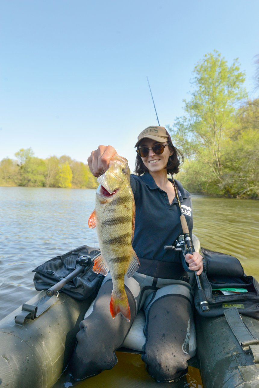En prenant tout le monde de vitesse, Maeva, ni une ni deux, enfile ses waders et gonfle son float-tube. Elle traverse sans coup férir le lac pour aborder la berge la plus encombrée. Deux lancers plus tard, sa canne se courbe. Sans finasser, elle extirpe des bois noyés une jolie perche qui arbore un jig ! Christophe ne cache pas son admiration. Quelques coups de palmes, et elle pose pour la photo de famille. Un check et le « duel » est lancé. Une petite battle amicale, rien de tel pour se taquiner !
