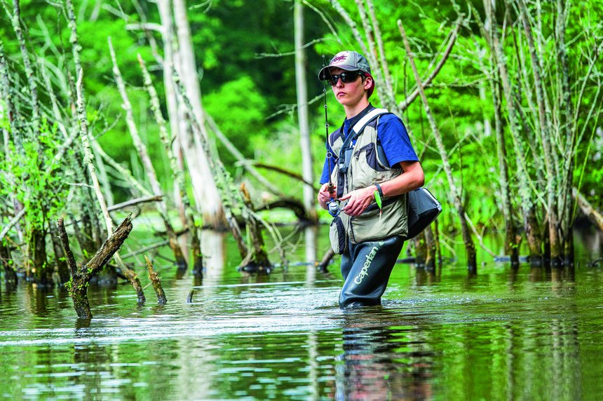 Voilà pour ce qui est de la « pleine eau », attaquons-nous maintenant à la pêche au cœur des herbiers, branchages et autres jungles végétales dans lesquelles l’eau s’étend parfois loin. Cette année, nombreux sont les plans d’eau qui ont retrouvé un niveau très élevé, qu’ils n’avaient pas atteint depuis un bon moment. La végétation rivulaire s’est développée entre-temps et elle se retrouve immergée. Excellente nouvelle pour la fraie de l’ensemble des espèces, mais un peu moins pour le pêcheur qui n’est pas équipé pour pratiquer dans ces entrelacs. Encore une fois, avant de se lancer, il convient de regarder quel type d’obstacle nous allons devoir surmonter. Il y a la bordure encombrée, mais avec tout de même, au travers, des espaces d’eau libre. C’est le grand classique d’une rive noyée avec des buissons, des massifs d’iris, plaques de nénuphars et autres touradons. Avec un peu d’adresse, on peut facilement utiliser les poppers et les stickbaits dans ce cas de figure. Le but est de poser le leurre sans bruit au plus loin dans la trouée pour lui octroyer la distance maximum pour évoluer. Une fois le poisson nageur sur l’eau, marquez une pause. Sur ces postes assez réduits, laisser le temps au brochet de tourner pour cibler son attaque est une des clefs de la réussite. Tout ce qui ressemble à un canal, goulet d’étranglement, est à prospecter en priorité. Le brochet n’est pas aussi agile que le black-bass pour chasser dans les milieux très encombrés. Choisissez toujours la fenêtre la plus large dans les obstacles et allez ensuite vers les espaces plus confinés. C’est prendre moins de risques de s’accrocher tout en optimisant les touches et les chances de sortir la prise sans encombre. Gardez toujours ceci en mémoire !