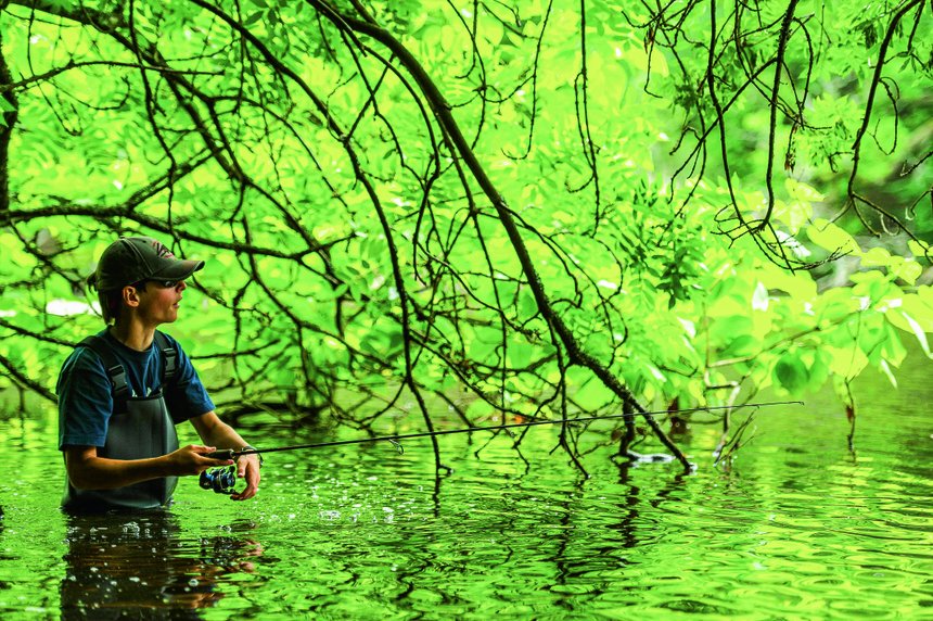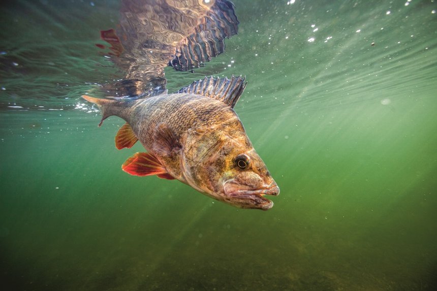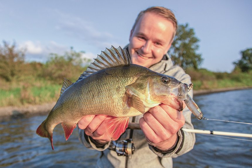 Si vous recherchez les perches dans ces zones d’eau libre, retenez seulement que plus il y a de profondeur et le milieu est vaste, plus vous devez pêcher avec de gros leurres. Pour les secteurs où l’eau est inférieure au mètre, les tailles de leurres comprises entre 50 et 80 mm conviennent parfaitement ; alors qu’à partir de deux mètres, les tailles entre 95 et 120 mm seront plus indiquées. À la différence du brochet, il convient de récupérer les leurres de manière un peu plus rapide et, surtout, au moindre soupçon de suivi, il faut accélérer. Plus il va y avoir de remous, plus les mâchoires claquent derrière votre popper ou votre stickbait et plus vous devez augmenter la vitesse de récupération! Ce type d’attaque est caractéristique de perches qui évoluent en bancs. Si vous tombez sur des gros poissons isolés, ils montent une seule fois à l’aplomb du leurre et, le temps que l’on réalise ce qui vient de se passer, la perche s’est déjà piquée. Les coups du soir en été sont de loin le meilleur moment pour réaliser du nombre sur cette espèce. Néanmoins, en rivière courante, les bordures ombragées et les journées avec un plafond bas peuvent livrer des poissons toute la journée. Si les zébrées montent et refusent le leurre, je vous invite à mettre un petit teaser en sauteuse trente centimètres devant celui-ci. Un petit leurre souple de type finess ou un petit streamer font parfaitement l’affaire. Dans ce cas de figure, si vous pêchez sur le domaine public, il convient de conserver un seul hameçon sur le leurre de surface, en général celui de queue, pour rester en conformité avec la législation. À ce petit jeu, les doublés sont fréquents et un bas de ligne en 0,24 mm est un bon minimum.