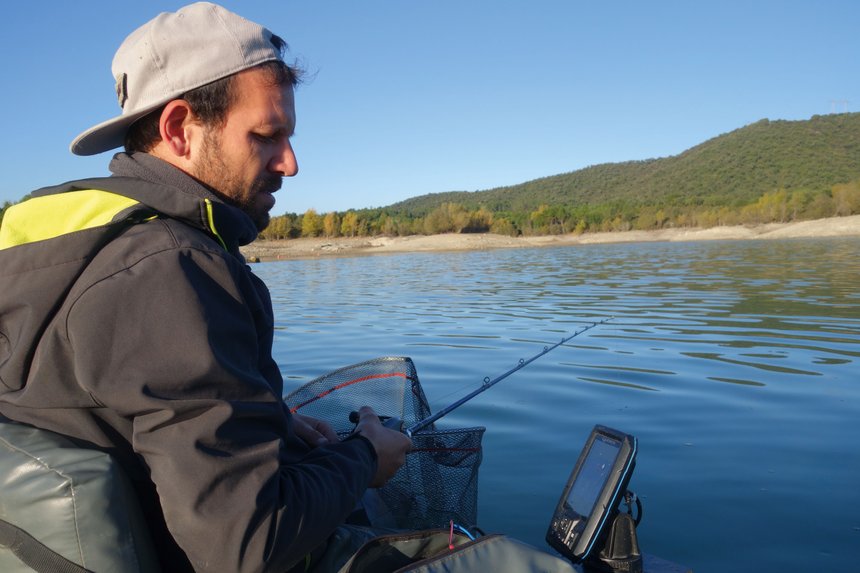 La première alerte est pour Yahn qui voit sa bannière se détendre. Un poisson vient de pousser son gros souple articulé. Deux lancers plus tard, un petit brochet s’attaque au big bait. Les poissons semblent encore assez timides, mais les deux pêcheurs restent confiants. «Je vais continuer à longer la bordure vers la route immergée, m’indique Léo. Cette structure concentre souvent des perches, des sandres mais aussi quelques silures. Yahn va me rejoindre et nous allons insister en verticale.» Quand l’un opte pour un discret leurre souple pour une prospection lente, l’autre choisit un petit leurre à palette. Le duo scrute sur le sondeur le moindre indice de présence de carnassiers ou de poisson fourrage. La structure semble être occupée par quelques poissons légèrement décollés et en pleine eau dans 4 m. Focalisé sur les échos, le binôme prospecte de façon très méticuleuse. Yahn opte pour une animation lente, son cadet procède lui de manière plus énergique.