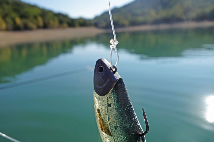 On dirait d’ailleurs que c’est la solution : touche franche dès le premier contact, Léo identifie sans hésitation un silure ! Son ensemble light souffre et la tresse, en frottant sur la structure, cède quelques instants plus tard. Le lac semble être à la hauteur de sa réputation : c’est difficile ! Ce bras sud, très découpé, se distingue par sa succession de pointes et de baies. La réussite comme l’échec peut venir du bon ou du mauvais choix de l’une d’entre elles. « Il n’y a pas assez de vent aujourd’hui, nous allons gagner la berge exposée, décide Yahn. Une anse offre un beau plateau d’herbiers qui tombe assez vite, nous pourrons pêcher plus creux. » Léo ouvre la marche et opte pour un gros souple de 18 cm. Il quadrille mètre par mètre une bordure très caillouteuse, le lac étant loin de son plus haut niveau. Le ciel se couvre légèrement avec l’arrivée d’un passage nuageux. Au détour d’un arbre immergé, Léo, toujours aussi concentré, repère un magnifique brochet, qu’il estime à environ 90 cm. Hélas, celui-ci se contente de suivre, bec collé sur son leurre, avant de replonger tranquillement dans les eaux émeraude.