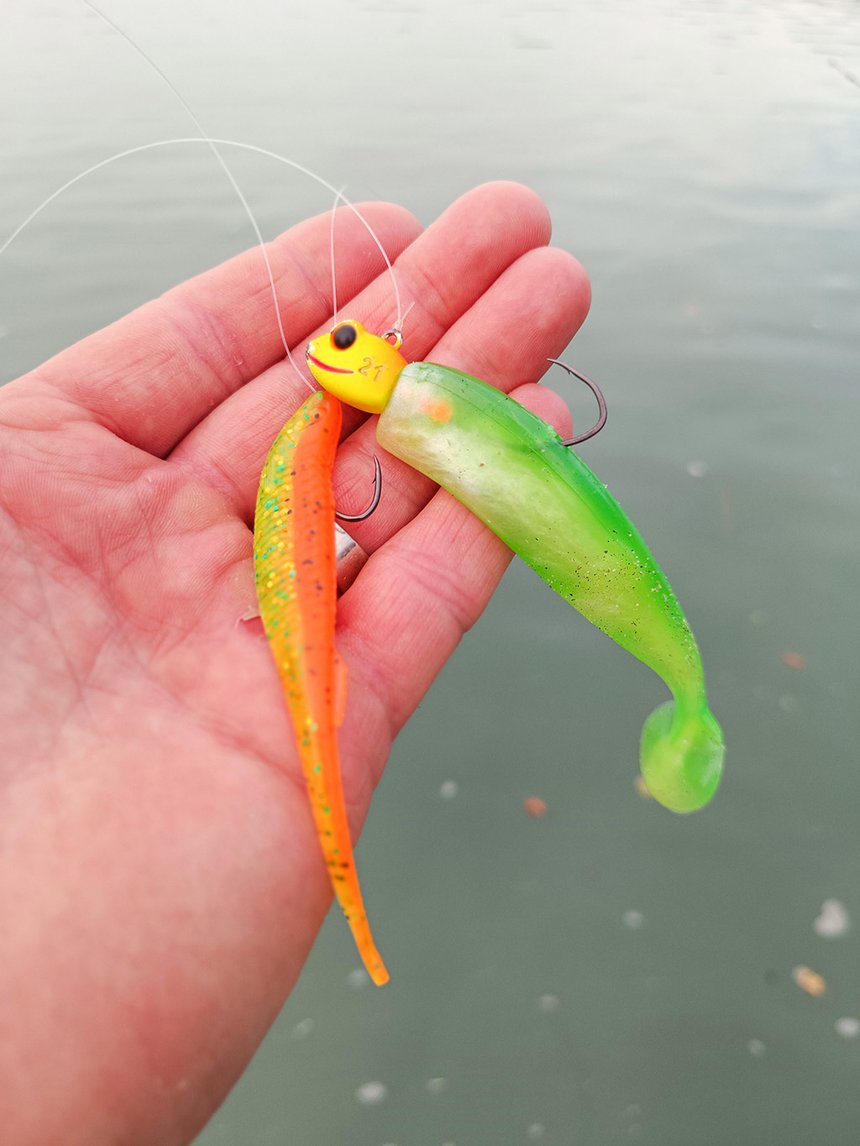 La première chose qui peut relancer l’agressivité des sandres, c’est de mettre deux leurres sur la ligne. Le fait d’employer un teaser a environ 50 cm au-dessus du LS du bas peut avoir plu sieurs intérêts. Avec un shad et un slug sur la même ligne, vous allez rapidement vous rendre compte du leurre le plus efficace. Bien sûr, il convient souvent de tester différents coloris et modèles de leurres souples avant de trouver réellement « le leurre » du jour. Simple à mettre en œuvre, le montage est réalisé sur un fil fluorocarbone de 30 à 35/100. Dans l’idée d’un montage « drop shot », le LS du bas est enfilé sur une tête plombée classique de 14 à 30 g. Le leurre du haut est enfilé sur un hameçon simple ou texan de belle taille, ce dernier étant attaché sur le fil par un nœud palomar. Pour ne pas déséquilibrer la ligne, le plus petit des leurres est placé sur l’hameçon du haut. Ainsi, de multiples combinaisons de couleurs, de tailles, de formes sont envisageables, toujours en respectant les règles dans la sélection des LS. Lorsqu’une touche est perçue, il est intéressant d’observer le leurre qui a été attaqué. Il convient alors de changer la couleur du leurre qui n’a pas été menacé, afin de procéder par élimination. Employer deux LS sur la même ligne facilite la sélection du leurre de jour. Mais, plus encore, il déclenche également chez les percidés une forme d’agressivité en concurrence alimentaire. Perturbés par l’apparition de ces deux proies faciles, les sandres viennent mettre un coup de mâchoire dans un des artificiels. Le fait d’employer un shad volumineux en bas et un petit grub en haut ressemble à une poursuite, une chasse. Le carnassier entre alors dans cette concurrence alimentaire et son agressivité est stimulé. Bien évidemment, il cible l’artificiel qui l’intrigue le plus. Une fois le LS le plus efficace trouvé, vous pouvez revenir sur une verticale classique.
