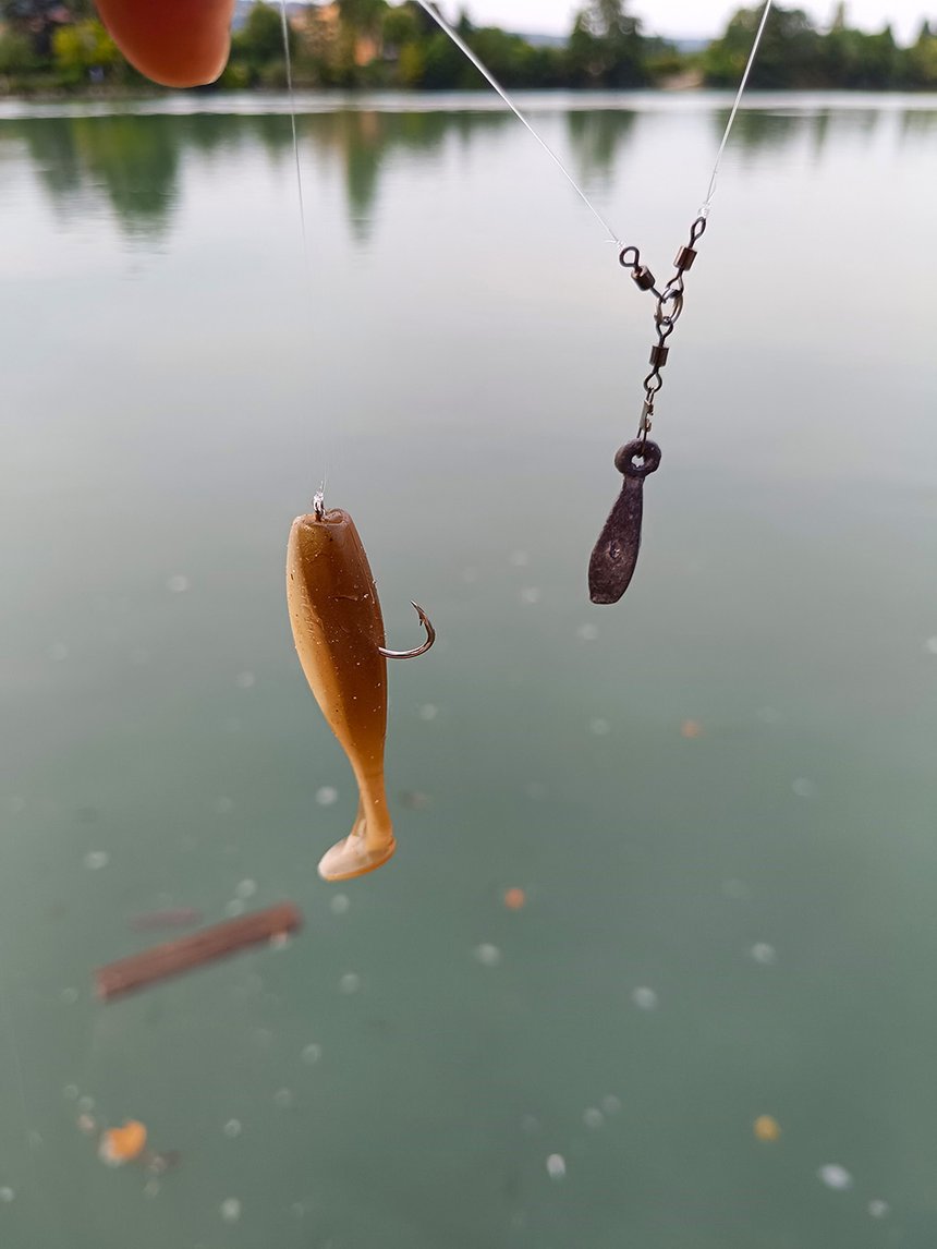 Inspiré de la pêche du « doré » au Canada, une présentation différente va nous permettre de déjouer la méfiance des carnassiers. Le fameux « marcheur de fond », comme l’utilisent les pêcheurs canadiens, est redoutable sur les carnassiers. Il est donc évident que cette présentation soit également efficace sur nos percidés. Si, de l’autre côté de l’Atlantique, cette pêche se pratique essentiellement en traîne, nous l’avons adaptée afin de pêcher plus lentement et respecter la législation. Toujours en technique verticale, nous utilisons une tresse de corps de ligne en 14/100 suivie d’un bas de ligne long d’environ 1 m en fil fluorocarbone de 35/100. À l’extrémité du fil est raccordé un émerillon baril. Ce dernier est enfilé à son tour sur un anneau brisé comportant deux autres émerillons barils. Les trois barils enfilés sur le même anneau brisé sont de 10 kg de résistance. Le second baril, lui, est raccordé à un plomb poire d’environ 20 g. Enfin, sur le troisième baril est raccordé un bas de ligne en fluoro de 30/100, long d’environ 1 m. Un hameçon simple texan ou droit vient armer un LS qui évoluera lentement au ras du fond. Il est possible de placer le plomb poire sur une empile en fil Nylon de 20/100, d’environ 20-30 cm, afin de surélever le shad ou le grub du fond. Redoutable sur des poissons éduqués, ce « traînard » vertical reste assez méconnu en France. Ce qui fait l’efficacité de ce montage, c’est la nage du leurre qui est complètement naturelle, car ce dernier n’a pas de lest. Il est donc possible de réaliser des pauses, afin de laisser l’artificiel tomber lentement vers le fond. Et souvent, c’est à ce moment précis que le leurre est aspiré. Même s’il y a un mètre de bas de ligne, les touches sont souvent franches. Le LS n’ayant aucune retenue, il part profondément au fond de la gueule du carnassier. Les brochets ne résistent pas à l’envie d’attaquer notre montage.