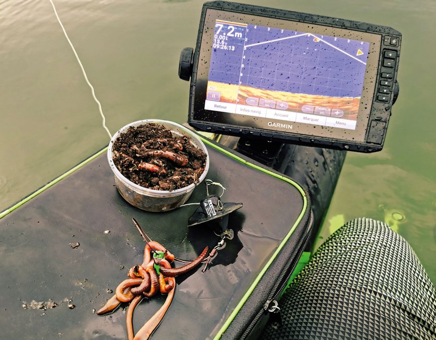 « La seule chose qui peut venir troubler ce silence, ce sont bien sûr quelques petits coups de clonk qui sont pour moi indissociables de la pêche à soutenir aux vers de terre. Malgré toutes les discussions au sujet de son utilisation, ce bruit les faits et les fera toujours réagir. Cela me donne des indices précieux sur leur positionnement et leur humeur, même si parfois ce bruit peut provoquer quelques refus », témoigne-t-il. « Et puis, en matière d’accessibilité de la pêche à soutenir au plus grand nombre, le float tube est quand même une chouette option ! Les prix des modèles vraiment adaptés à la pêche du silure en toute sécurité avoisinent 400 à 450 euros aujourd’hui. » Le choix de Laurent s’est porté vers un float tube Madcat Belly Boat qu’il accessoirise selon ses préférences au moyen de patchs de fixation. « En fin de compte, ma configuration de base, celle qui me rapporte le plus régulièrement des poissons, c’est tout simplement mon float tube, un petit échosondeur, ma ligne directement tenue à la main, un gros plomb, plastifié mais nu, un bas de ligne, un triple et une belle boule de vers. Simple mais une efficacité chirurgicale. »