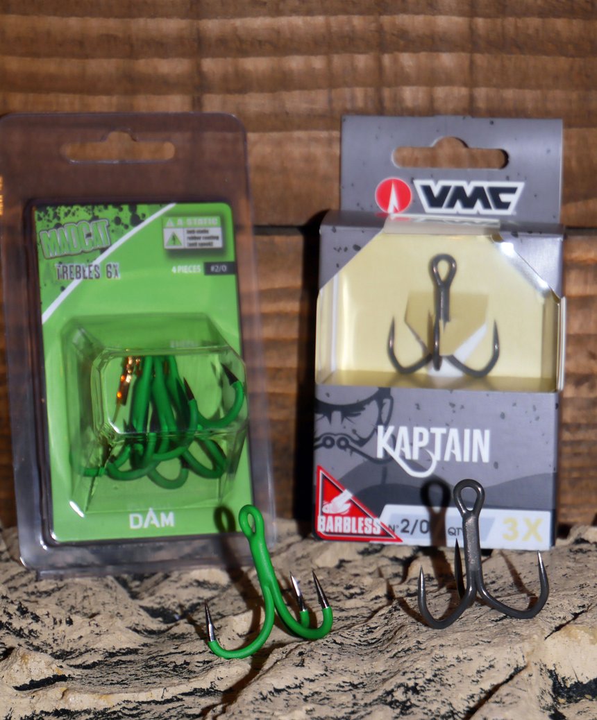 Le montage ressemble à celui à dandiner pour les perches, mais en version XXL. Laurent et moi insistons sur le fait que, dans cette simplicité, tous les composants doivent être sélectionnés avec soin. La tresse de corps de ligne est de gros diamètre et de grande résistance, plus de 50/100, au moins 50 à 60 kg de résistance linéaire. Les touches, tantôt discrètes, tantôt d’une violence inouïe, ne sont pas encaissées par l’élasticité d’un blank de canne. Toute la force mécanique se reporte sur la ligne, ses composants… et vos muscles ! Le choix de l’hameçon triple est déterminant. Il doit allier discrétion, finesse de fer, piquant exceptionnel et grande robustesse à l’ouverture… Laurent mise sur une qualité de touche augmentée grâce à des hameçons antistatiques recouverts d’un composant caoutchouc protégeant cette pièce métallique des contacts directs des silures et de leurs barbillons aussi agiles qu’une main pour palper nos présentations et pour détecter les pièges (MadCat A-Static Treble Hook 6X). Pour ma part, j’aime le compromis de performance piquant/robustesse des Kaptain 3X (VMC, 7557 Kaptain 3X) qui, grâce à leur courbure particulière, permettent de solidement ancrer les poissons même sur les touches courtes dans les parties dures de la mâchoire.