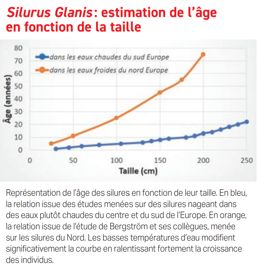 Le silure est une espèce qui s’acclimate d’autant plus rapidement que les eaux dans lesquelles elle évolue sont élevées, avec des températures optimales pour la reproduction et la croissance comprises entre 25 et 28°C. C’est donc dans les zones centrales européennes et l’Europe de l’Ouest que les conditions thermiques sont les meilleures. Plusieurs études antérieures démontrent que cinq à sept années de vie sont nécessaires aux silures pour atteindre 70 à 130 cm et devenir matures sexuellement. La croissance annuelle moyenne avant la maturité sexuelle est de 10 à 20 cm et diminue ensuite de 5 à 7 cm. Dans ces biotopes aux eaux plutôt chaudes, les estimations de longévité jusqu’aujourd’hui ne dépassent guère 30 années, avec un seul individu documenté dans la littérature scientifique ayant atteint l’âge de 33 ans. Ces études datent de plus de quinze ans pour la plupart et sont issues uniquement de biotopes aux températures d’eaux élevées en moyenne.