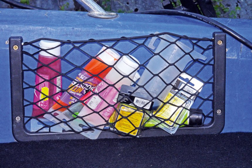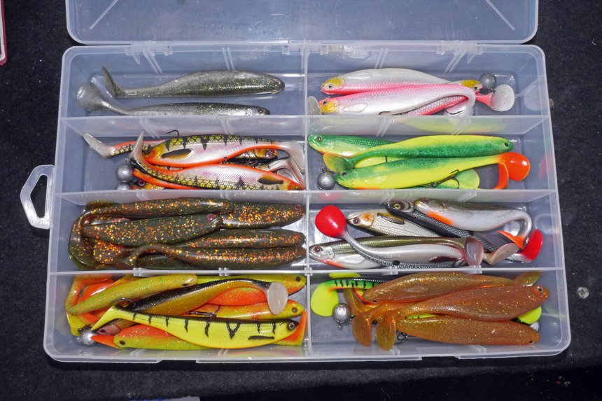 C’est d’ailleurs ce qui nous arrive aujourd’hui lors de nos premières traques. Ce qui ne m’empêche pas de trouver d’entrée cette approche addictive… Comparée à une pêche en linéaire classique, on a là la certitude d’être suivi, on voit sur l’écran le poisson suivre le leurre. En fonction de ça, Rémi a mis au point une méthodologie mathématique, limite chirurgicale, qui lui permet généralement de trouver le leurre du jour et la manière de déclencher les attaques ! Avant d’entamer cette chasse aux pélagiques, Rémi a préparé deux LiveCast W3 (Westin), des cannes qu’il a contribué à concevoir très spécifiquement pour cette approche. La première est une 30-80 g pour 2 m, dédiée au lancer des leurres finesses, grubs et shads de taille moyenne (13 à 20 cm) sur des bas de ligne en fluorocarbone (50 à 60/100). La seconde est plus puissante (60 à 140 g) et plus longue (2,23 m), conçue pour de gros voire très gros shads sur des bas de ligne fluoro (100/100). Sur le bateau, les boîtes de leurres dévoilent un vaste éventail… À partir de ce moment-là, la folle rotation des leurres commence. Tous les deux ou trois lancers réussis puis suivis mais non sanctionnés d’une touche pour le même leurre, Rémi change ! Et ce matin, c’est une valse ininterrompue jusqu’à ce que, après un orage, la première touche claque enfin !