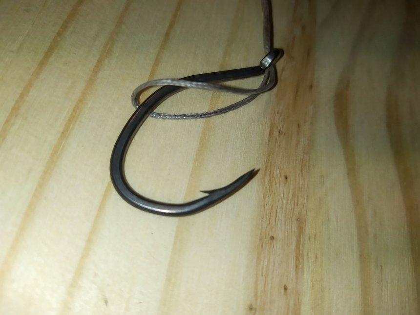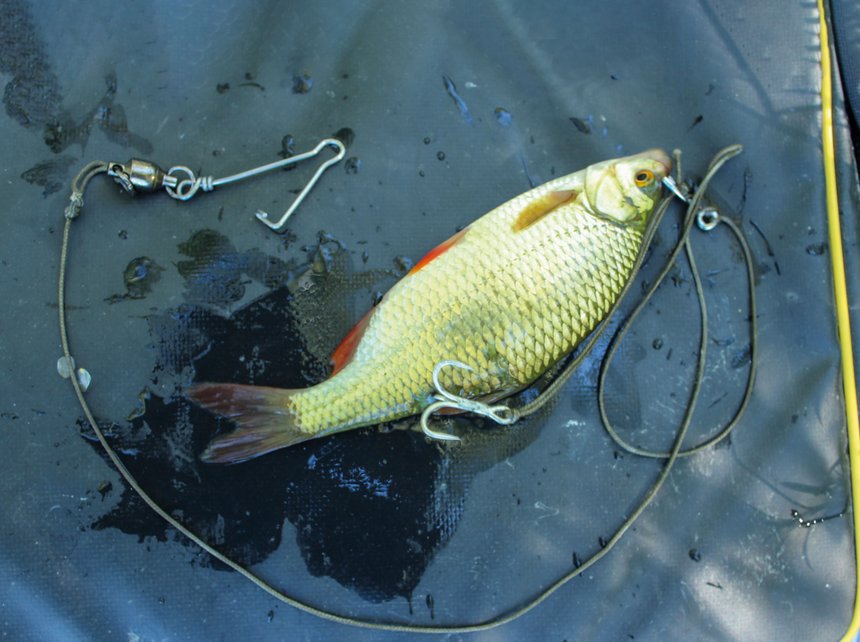 Deux possibilités s’offrent à vous, le montage au flotteur sous-marin ou le bouchon coulissant. Le montage au flotteur coulissant sera préféré pour une prospection dynamique le long de la bordure. À l’inverse, le flotteur sous-marin est plus dédié pour une pêche statique à poste fixe. Ce dernier est constitué d’une tresse de corps de ligne en 40/100 sur laquelle est enfilé un plomb coulissant de 200 à 300 g. Celui-ci est suivi par une perle d’amorti en caoutchouc. Elle préserve le nœud qui raccorde le corps de ligne à un émerillon baril de 80 lbs de résistance. Sur le second œillet de ce baril, un bas de ligne long d’environ 80 cm est raccordé. Il est réalisé en tresse de combat de 100 à 150 kg de résistance. Sur celui-ci, on enfile le flotteur sous-marin d’au minimum 50 g de portance. Il est immobilisé sur le bas de ligne par deux nœuds simples. Le flotteur sous-marin sert à décoller le vif du fond et ainsi à le rendre plus détectable par le silure. Pour une question pratique, une boucle est réalisée à chaque extrémité du bas de ligne. Ces dernières permettent de rendre démontable tout le bas de ligne. Positionné à environ 15 cm derrière le flotteur sous-marin, un premier hameçon simple de 1/0 à 4/0 est raccordé par un nœud dit « boucle dans boucle ». Des tours morts sont réalisés autour de la hampe de l’hameçon. Cette opération permet de positionner l’hameçon simple dans l’axe de la ligne, de l’immobiliser et d’adapter l’écartement du triple par rapport à la taille du vif. Également raccordé par un nœud boucle dans boucle, le triple vient terminer l’armement du vif. Ce dernier est piqué par le nez sur l’hameçon simple, le triple est placé au niveau de la nageoire dorsale du vif.