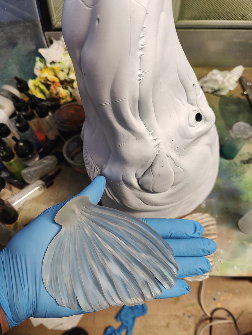 Une fois le dessin 3D sauvegardé, il passe à l’impression en 3D. Il s’est équipé d’une imprimante gros volume dont la précision est de l’ordre du micron ! Le matériau utilisé est une résine UV qui polymérise au soleil, il doit donc opérer dans une pièce à volets fermés. L’imprimante procède par couches, un faisceau lumineux, correspondant au dessin, passe sur la partie à durcir de chaque strate et les soude entre elles. Xavier imprime les nageoires de ses sculptures séparément pour faciliter le transport sans risque de casse, lors des envois ou des éventuels déménagements et parce qu’il utilise une résine différente, transparente, pour que le rendu final soit des plus réalistes. Les nageoires sont dotées de pas de vis et se fixent sur le buste. L’imprimante travaille seule, il faut deux jours pour réaliser une œuvre.