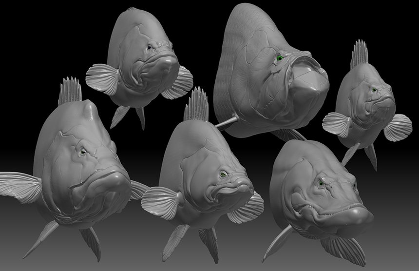 Xavier réalise ses dessins 3D sur Maya et ZBrush, deux logiciels complémentaires. Il utilise une tablette et sculpte une base cubique à l’aide d’un stylet. Il conserve sous les yeux ou en transparence sur son écran des photos de grands poissons et des dessins de Tommy Kinnerup, artiste américain réalisant les visuels de la marque Savage Gear dont il apprécie le style. Xavier est perfectionniste et passe du temps sur les détails, il peaufine la dentition, les écailles et même les cicatrices de ses créations. Mais son style, c’est de leur donner une expression humaine et agressive, c’est sa signature visuelle.
