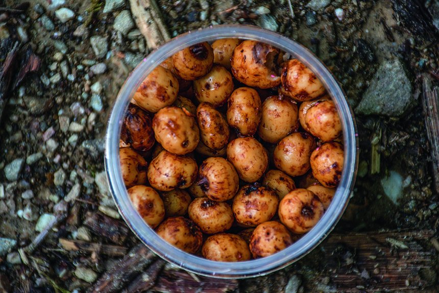 Enfin, au niveau de la couleur, tout est possible. Personnellement, je préfère des appâts sombres, sobres, et évite les billes de couleurs trop vives. En ce qui concerne l’intérêt gustatif, c’est là que tout se complexifie. Aucune étude sérieuse ne démontre l’intérêt de tel ou tel élément dans le choix gustatif des poissons. Au-delà de quelques expériences qui tentent d’aboutir à des conclusions, nous sommes assez démunis face à ce sujet. Gardons tout de même en tête qu’un simple grain de maïs reste l’esche la plus attractive et, par conséquent, il vaut mieux s’orienter vers quelque chose de simple mais fiable plutôt que vers quelque chose de très sophistiqué qui pourrait malencontreusement s’avérer « répulsif ». Enfin, pour l’attractivité, plusieurs stratégies sont valables. Pour décupler l’attractivité d’un amorçage, j’aime employer des liquides qui s’imbibent dans les bouillettes et ainsi libèrent rapidement et de façon intense des attractants. Typiquement, le fait de faire tremper mes appâts une poignée d’heures dans un mélange de booster et d’eau le prépare pour qu’il soit ultra instantané et attractif. Une autre stratégie qui fonctionne en milieu sauvage consiste à panacher ses bouillettes avec d’autres éléments tels que des noix tigrées, du maïs doux, du blé, du chènevis ou des pellets, pour ne citer que les plus connus. Cette association permet alors de jouer sur plusieurs tableaux en libérant différents éléments olfactifs, mais aussi d’attirer d’autres poissons qui, par l’activité générée, finissent par attirer les carpes sur votre coup et atténue l’effet « ovni » que peut déclencher une bouillette.