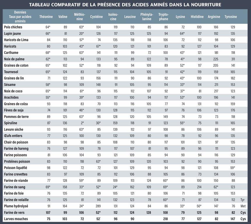 Le rôle des acides aminés est de permettre la synthèse des protéines. Ces protéines sont constituées de petites unités de structure, les acides aminés. L’organisme animal et humain ne peut pas synthétiser lui-même les acides aminés essentiels. Voi là pourquoi ces derniers doivent être apportés par l’alimentation. Il en va autrement des acides aminés non essentiels, que l’organisme (humain, poisson…) peut synthétiser lui-même. La situation est similaire pour les lipides, qui se composent en grande par tie d’acides gras essentiels et non essentiels pour les animaux. Il y a 9 acides aminés essentiels. Chacun d’entre eux joue un rôle important.