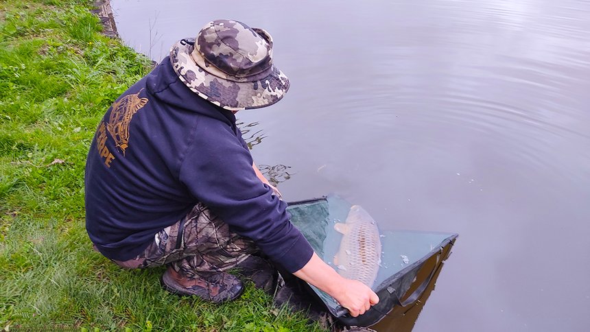 Lorsque le poisson est dans l’épuisette, ôtez l’hameçon pour qu’il ne se prenne pas dans le filet et augmente les blessures. Faites une légère pression perpendiculairement à la pointe pour dégager l’ardillon des chairs. Redoublez de prudence avant de soulever l’épuisette ! En effet, hors de l’eau, le poisson n’est plus supporté par la poussée d’Archimède et la totalité de son poids repose sur ses nageoires qui, bien évidemment, ne sont pas prévues pour cela. Il convient de déboîter les deux bras de l’épuisette, de passer sa main de la tête vers le ventre du cyprinidé pour s’assurer que les pectorales soient bien collées au corps avant de rouler un peu le filet sur les bras et de le soulever. Cela s’entend si vous souhaitez peser le poisson et le photographier hors de l’eau. Sinon, il est plus simple de prendre la photo dans l’eau, avec des waders. Autre solution, plutôt que de soulever l’épuisette qui n’assure pas toujours une bonne prise, glisser là dans un « brancard » (traduction de « retention sling ») que vous emmènerez sur la berge jusqu’au matelas de réception préalablement mouillé. Soulevez délicatement la carpe en retirant l’épuisette vers la queue, et non à « rebrousse écailles » pour justement préserver sa belle écaillure (et non écaillage, action d’ôter les écailles).