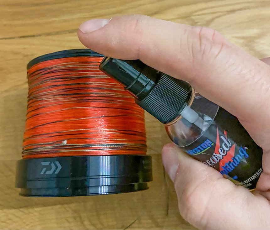 Personnellement, j’aime utiliser une éponge mouillée pour pincer ma ligne et la tendre juste au-dessus du pick-up. Le passage du fil dans cette dernière permet d’égoutter l’excès d’eau, d’empêcher qu’il ne chauffe et de le nettoyer pendant qu’on l’embobine. Employer cette astuce à la fin de chaque partie de pêche vous permettra d’augmenter la longévité de votre corps de ligne et de réduire le phénomène de vrillage, surtout lorsqu’il fait chaud comme en été.