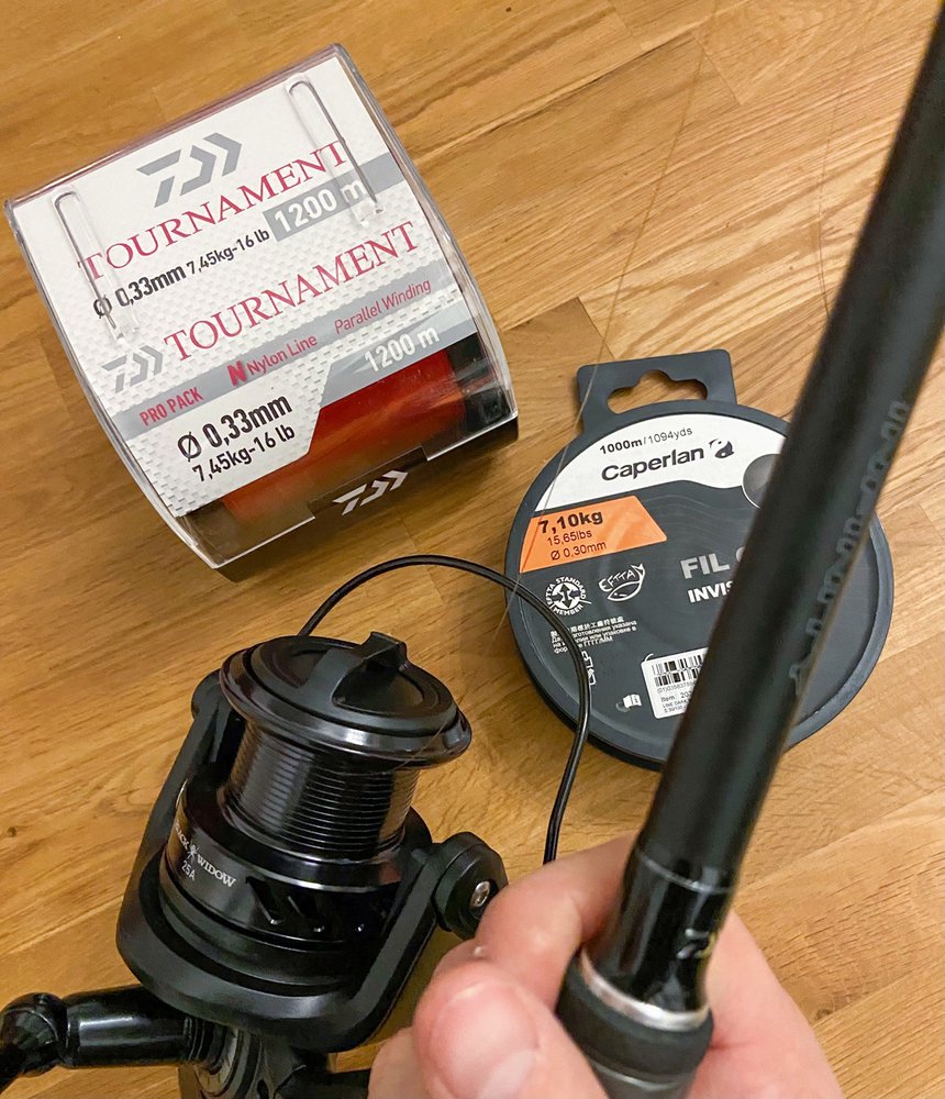 En nylon, on remplit quasiement toute la bobine tandis qu’en tresse, on s’arrête 1 mm avant le bord ! La capacité de certaines bobines est plus ou moins importante et c’est rare que les 300 m de Nylon en 30/100 que vous avez prévu de mettre suffisent pour obtenir un résultat satisfaisant. Pour éviter de consommer beaucoup de fil de bonne qualité, on positionnera alors en fond de bobine, un fil peu cher et bas de gamme que l’on appelle couramment « backing ».