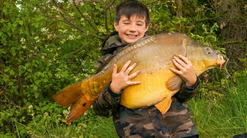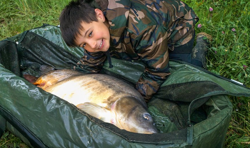 Un peu avant midi, je vais marcher, faire le tour du lac et vérifier l’état des chemins. Ce qui devait arriver arriva… Après 30 minutes de balade, j’entends mon cher garçon crier à l’aide : il y a visiblement eu un départ sur sa canne… Lorsque j’arrive, un sentiment de fierté m’envahit. Il a géré le début du combat tout seul et la carpe est en train de rendre les armes. Je prends l’épuisette et attends la belle. Au premier coup d’œil je repère un très beau poisson ! C’est une miroir de près de 15 plombes qui gît au fond du filet. Paul et moi exultons: nous vivons un moment à la fois très commun mais si intense ! C’est absolument génial ! Après quelques minutes au sac, pour que la belle se repose, nous immortalisons ces instants magiques !