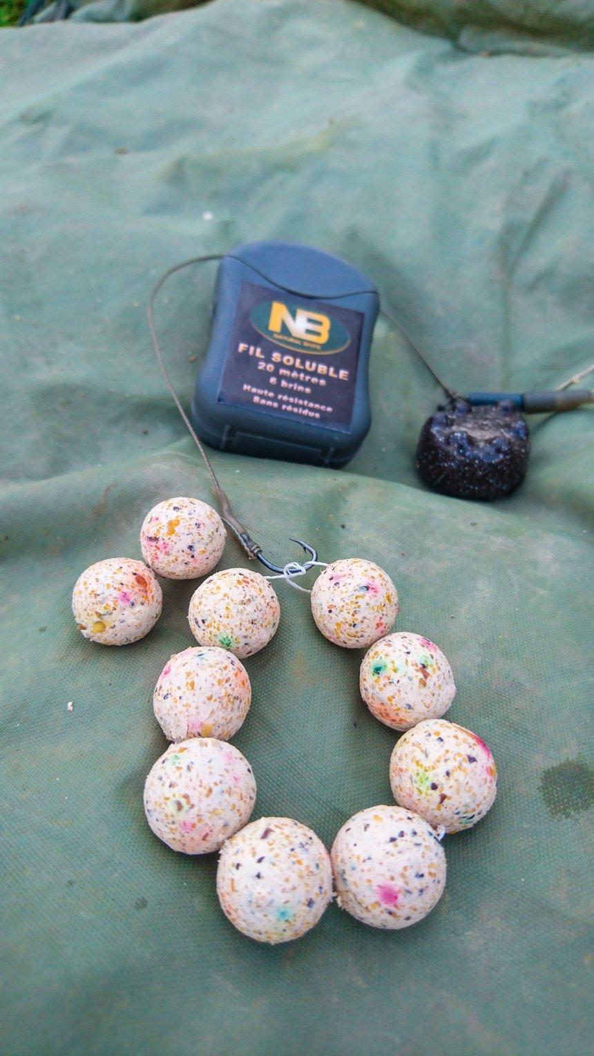 Mathieu ayant pris l’heureuse initiative d’amorcer par deux fois avec des billes Karp One au monster Crab et sachant que la tranquillité attire les carpes, je décide de descendre par les champs et le chemin détrempé, malgré l’inquiétude de Paul. Au pire nous irons demander poliment de l’aide aux agriculteurs du coin. Nous allons de surprise en surprise. La première, en arrivant sur le poste convoité, est la découverte d’une petite cabane destinée à abriter du matériel de pompage. Ni une ni deux, pour gagner du temps je propose de squatter sagement cet abri providentiel ! Nous déballons le matériel et là, deuxième surprise : le bateau amorceur ne démarre pas à cause d’un interrupteur fatigué ! J’ai beau insister, monter, démonter, remonter, bricoler, rien n’y fait… C’est la grosse déconvenue. Paul est un peu déçu mais, dans un élan passionné et entraînant, je lui affirme qu’on va réussir à pêcher quand même. Il placera tout seul sa canne et je ferai le commis pour l’amorçage. Nous avons 4 cannes et je connais plutôt bien les lacs d’irrigation et leur topographie générale. Une canne en bordure, une autre devant un bel arbre immergé, une autre sur la pente d’une île. On pêche « à l’ancienne » mais avec le cœur !