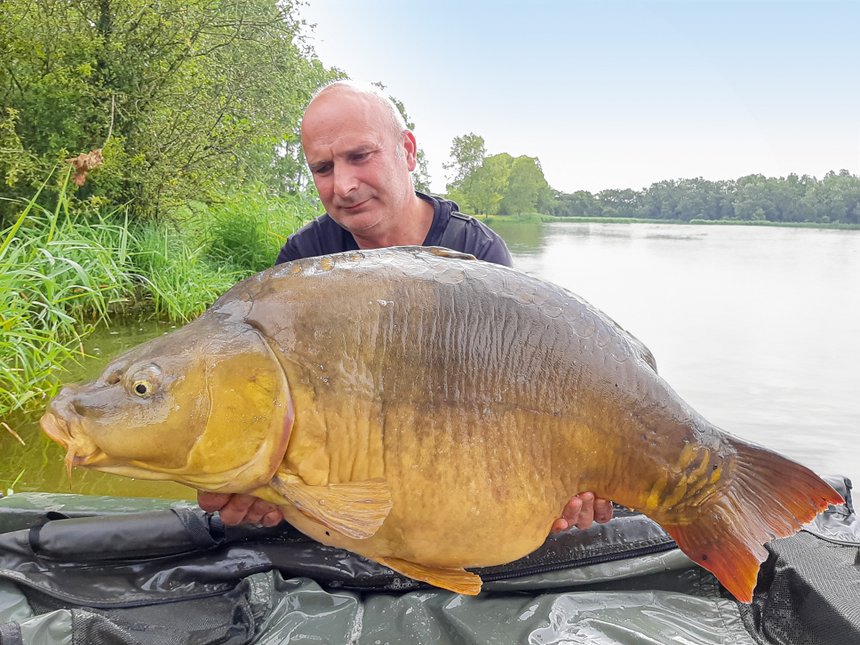 Dans les plans d’eaux privés comme celui-ci, je m’efforce de toujours travailler les carpes avec le plus de souplesse possible car leurs bouches sont sollicitées tout au long de l’année alors autant limiter au maximum les dégâts en y allant tranquillement et en ne leur laisser en souvenir, qu’un simple petit piercing, à peine visible une fois l’hameçon sans ardillon retiré. Quelques minutes s’écoulent et je vois monter une joli miroir très épaisse. Elle n’est pas très longue mais alors quelle largeur ! Elle me rappelle une conversation avec mon ami Patrick Salord… C’est un poisson qui flirte avec les 20 kg, je suis heureux de ce début prometteur. Je replace rapidement ce montage esché d’une bouillette dense Ginger Pepper de 15 mm avec un faux maïs flottant rose. J’ai opté pour une stratégie de pêche au rappel sur un unique coup volontairement serré. Et d’une, cela va me faire travailler ma précision et de deux, j’ai des chances d’accélérer le rythme des touches qui ne sont pas légion en ce moment sur l’étang. Si j’en crois les dires des deux pêcheurs qui exploitent en même temps que moi les postes 1 et 2, ils n’ont rien vu depuis leur arrivée, 24 heures avant moi. Mes amis qui m’ont accompagné, Thomas et David sont implantés aux postes 3 et 4. Puisque mon téléphone n’a pas émis la moindre sonnerie, j’en conclus qu’ils n’ont encore enregistré aucune touche. Le soleil continue à descendre et va bientôt disparaître quand un de mes swingers monte ! C’est la canne du milieu cette fois-ci et mis à part un maïs jaune à la place du rose, tout est pareil que pour le départ précédant. Après un combat très honorable c’est encore une miroir très typée proche des 20 kg qui vient me rassurer dans mon choix stratégique. Une fois le poisson relâché, je relance rapidement la ligne sur l’amorçage puisque c’est là que les touches se produisent et ensuite, j’effectue un rappel de 5 spods avant la nuit, pour inciter les carpes à revenir manger. Je continuerais même ce rappel régulier pendant la nuit car je ne voudrais pas perdre les poissons qui semblent avoir investi les lieux.
