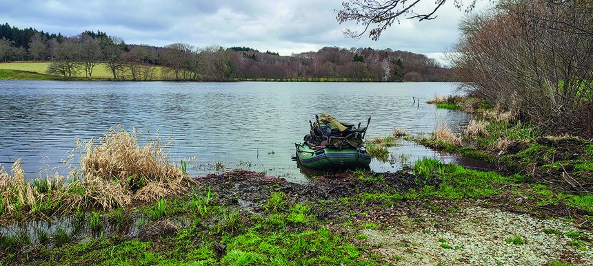 Comme convenu, Pierre m’attend sur la chaussée devant la maison du lac. On prend le temps de boire un café pendant qu’il me présente son étang et les 8 postes aménagés. J’ai réservé le n° 6, sur le dernier tiers amont. Je pense que c’est un bon choix en ce tout début de printemps, misant sur les températures qui devraient monter tout le long de la semaine et faire bouger les poissons vers des zones moins profondes. Je serai seul sur l’étang, ça me laisse toute latitude de bouger d’un poste à un autre si besoin. J’en profiterai également pour faire le tour des différents emplacements et en apprendre un peu plus sur le plan d’eau. Le temps de gonfler le bateau au niveau de la mise à l’eau nouvellement aménagée et d’y loger tout mon matériel et je me dirige donc vers le poste 6, seulement accessible par ce moyen, comme les autres postes mis à part les 1 et 8 qui sont accessibles du bord. Des poissons se manifestent à différents endroits du plan d’eau, dont un juste devant le ponton du 6 au moment de mon arrivée. Ça sent bon !